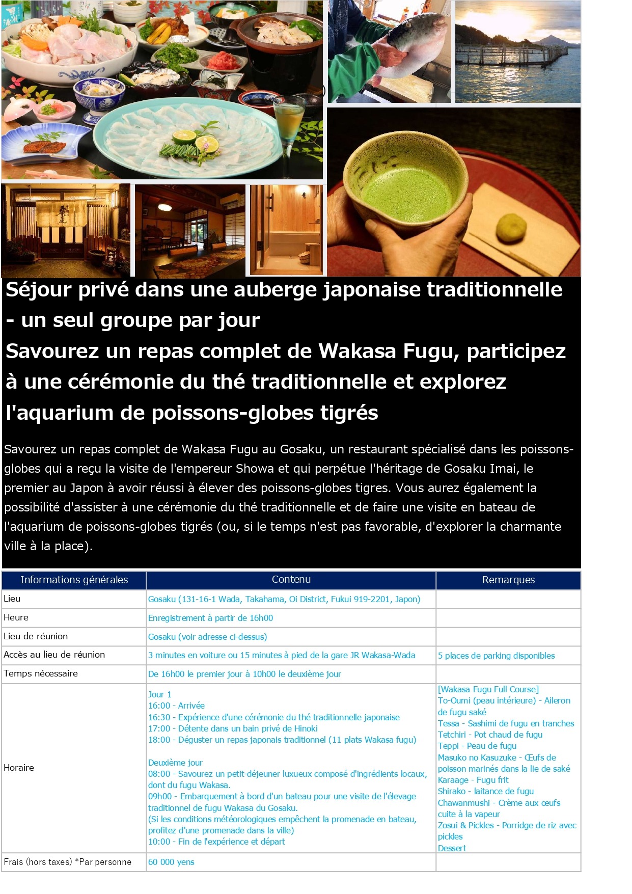 - 【Français】66. Séjour privé dans une auberge japonaise traditionnelle - un seul groupe par jour: Savourez un repas complet de Wakasa Fugu, participez à une cérémonie du thé traditionnelle et explorez l'aquarium de poissons-globes tigrés