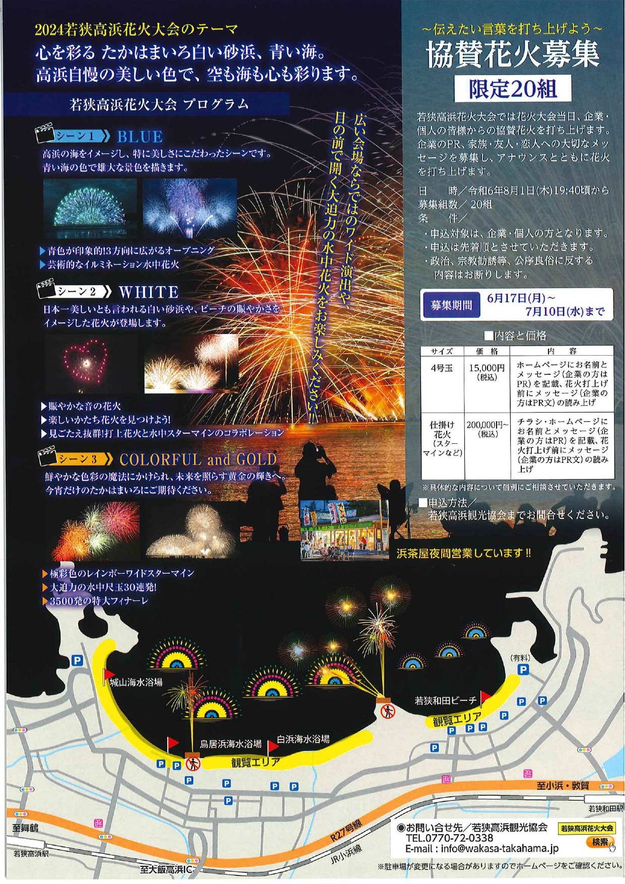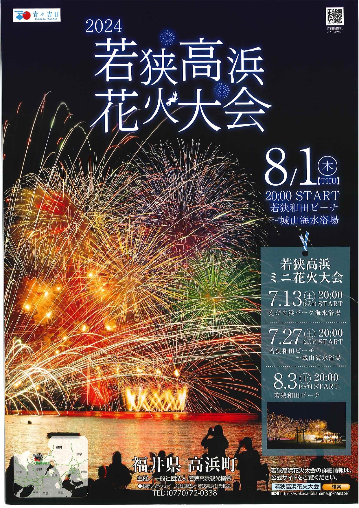 Le « Festival des feux d'artifice de Wakasa Takahama » attire chaque année de nombreux spectateurs et fait partie des traditions estivales de Wakasa Takahama.