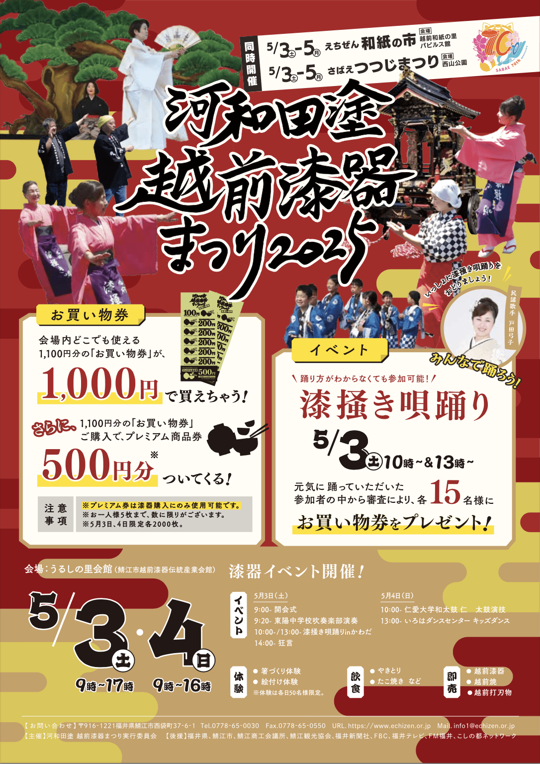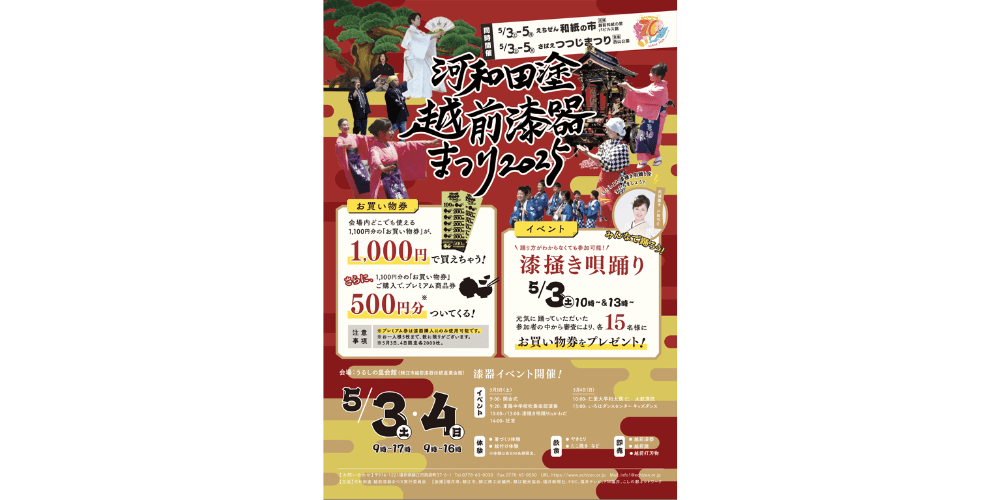 Des objets en laque d'Echizen, des poteries d'Echizen et des lames martelées d'Echizen seront en vente, ainsi que des ateliers de fabrication et de peinture de baguettes et un coin restauration.