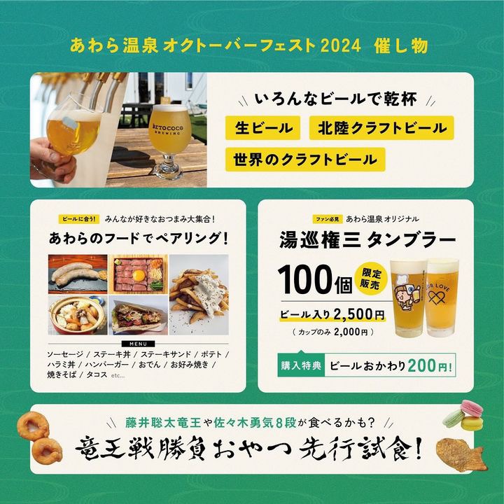 L'« Awara Onsen Oktoberfest 2024 » se tiendra les samedi 12 et dimanche 13 octobre à l'« Awara Onsen Yu no Machi Hiroba » dans la ville d'Awara.