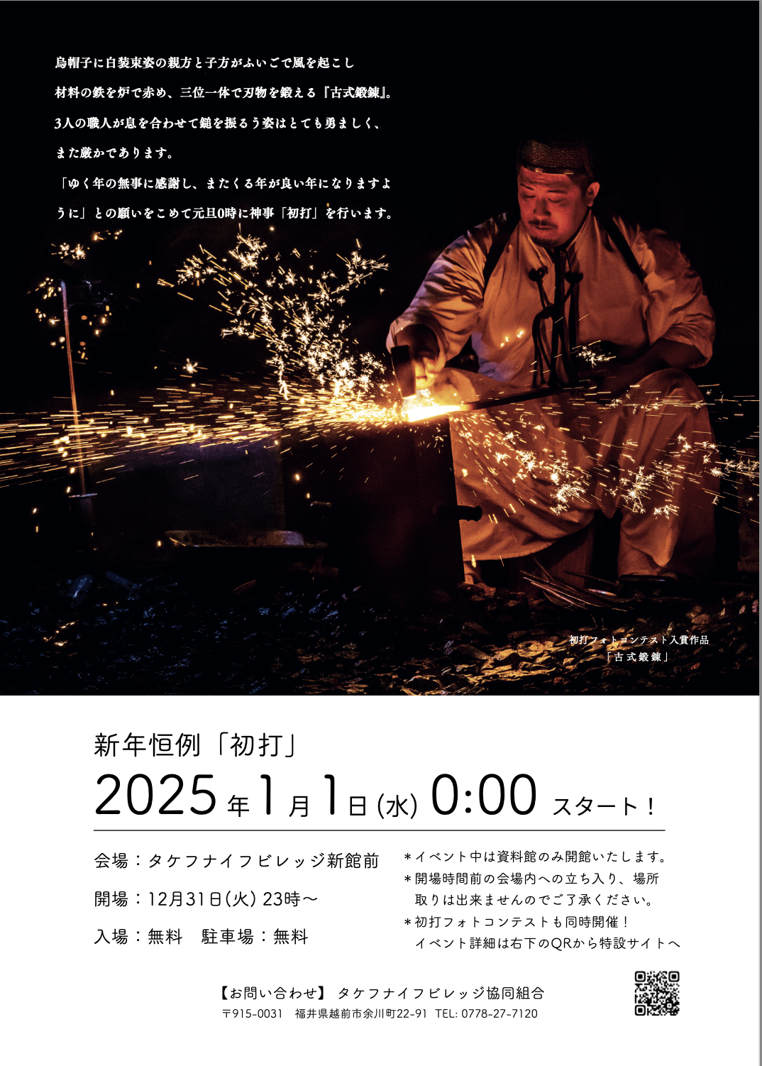 Le rituel « Hatsuuchi », qui a lieu chaque année à minuit le jour du Nouvel An depuis sa création, se tiendra à nouveau cette année au Takefu Knife Village, un atelier coopératif dédié à l'Echizen Uchihamono, un artisanat traditionnel de Fukui.