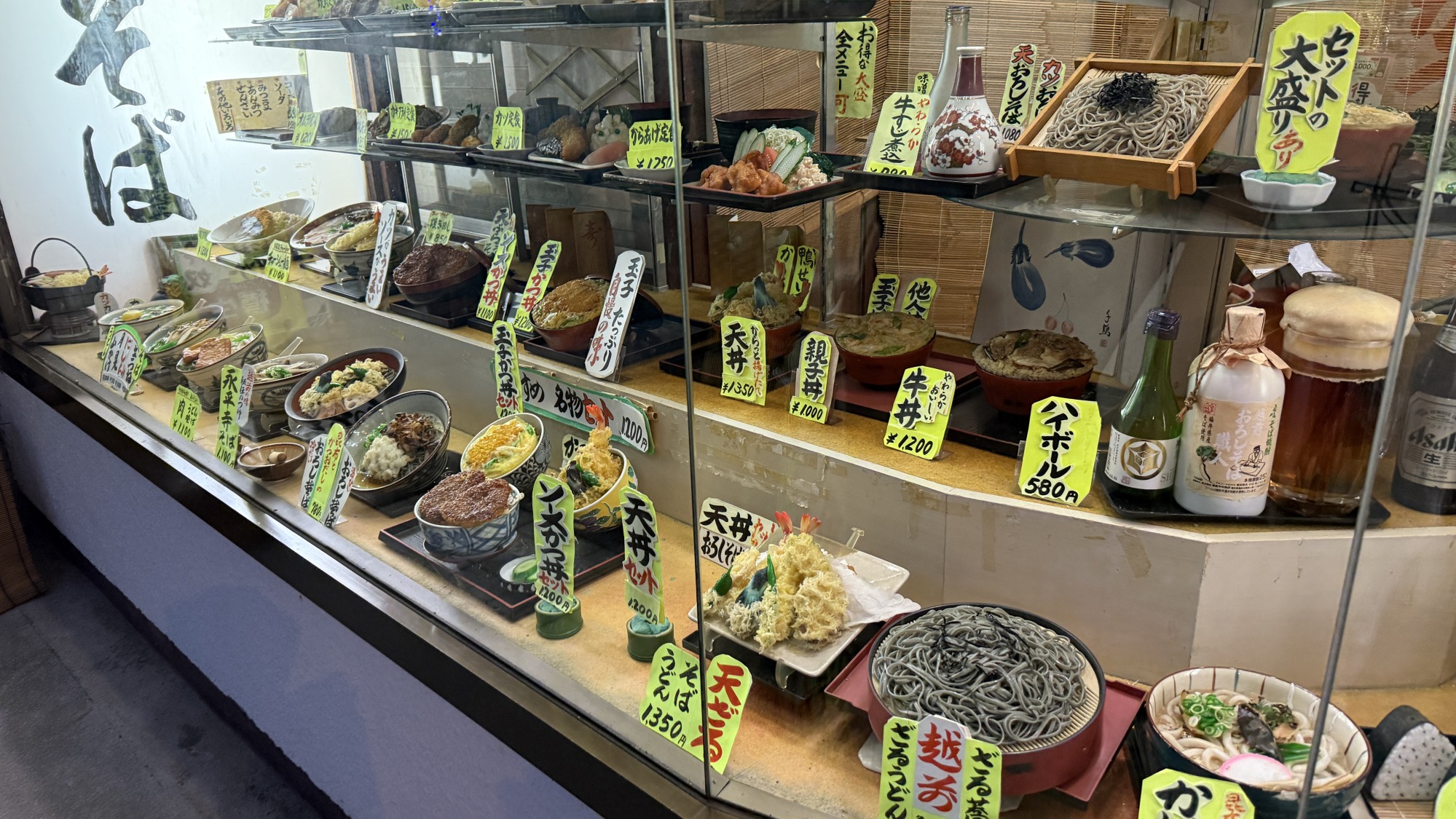 お店のショーウィンドウ(?)にはキラッキラの食品サンプルが所狭しと並び、手書きの豪快な筆文字メニューがお店の軒先を賑やかに盛り上げている。