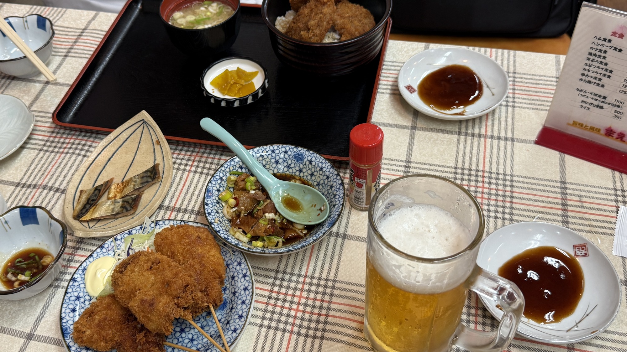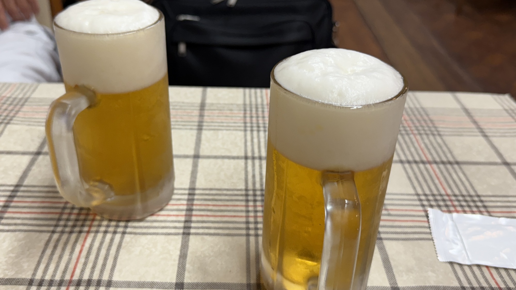 福井名物から定番おつまみまでメニューが豊富すぎて選べないので、とりあえず生ビールで乾杯する。
