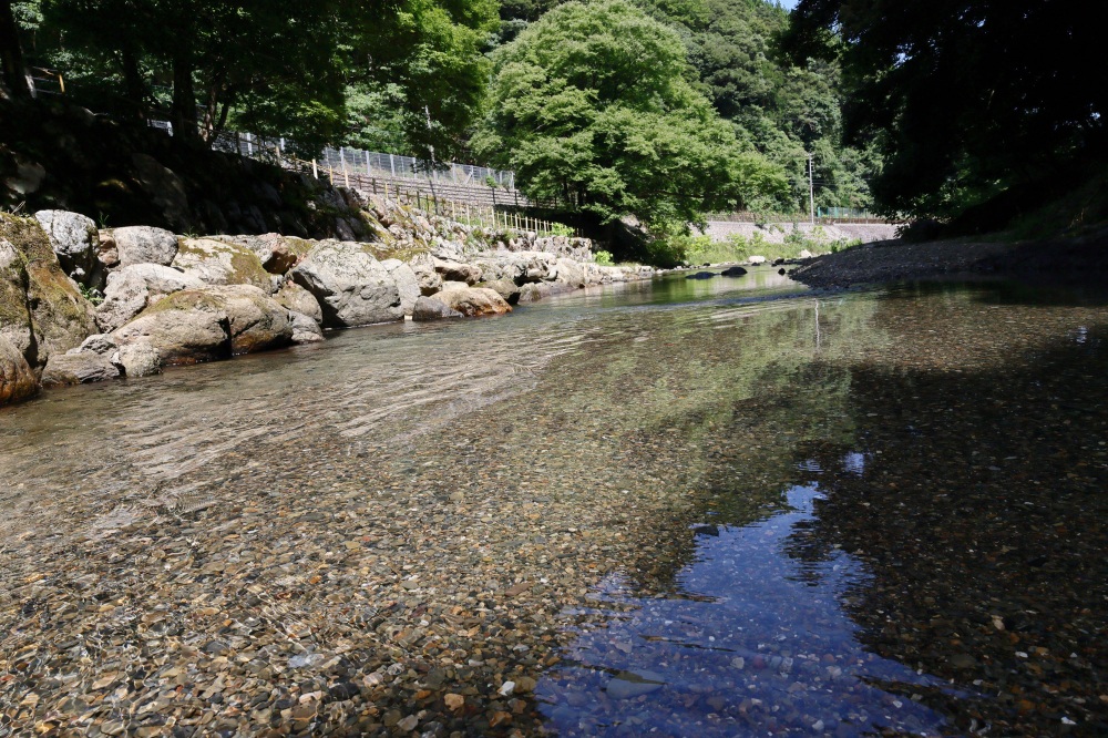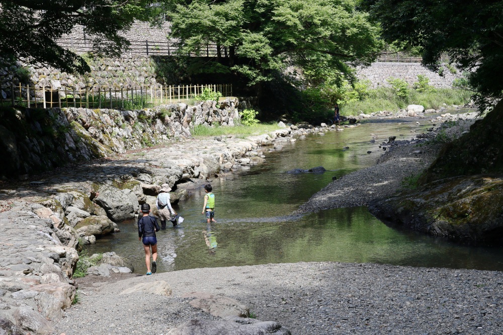 流れが緩やかな浅瀬では、小さいお子さんでも川遊びを楽しめます。また、木陰もあり、直射日光が強い日でも安心です。