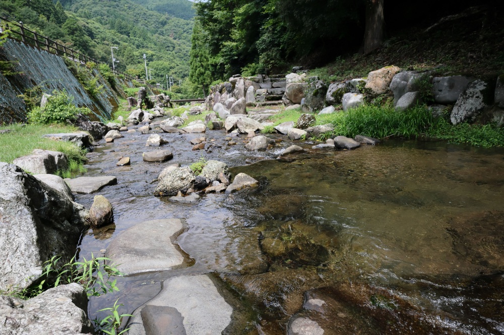 川への降り口は、駐車場から下流方向へ進むと、川へ降りる階段があります。また、もう少し歩いた先の鳥居からも川へ降りることができます。