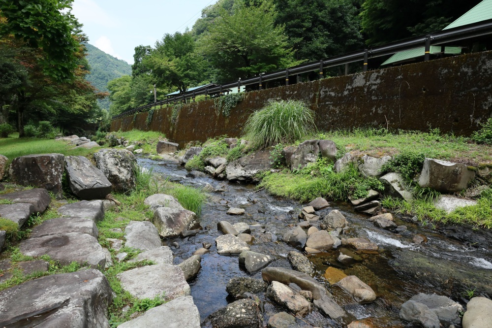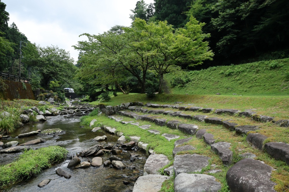 河原へ降りていくと、休憩などにちょうどいい石畳と中州があります。