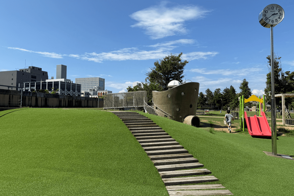 福井市役所のすぐ隣にある「中央公園」は、子どもがのびのび過ごせる広々とした都市型公園。