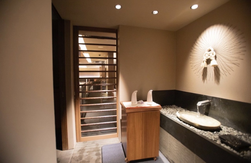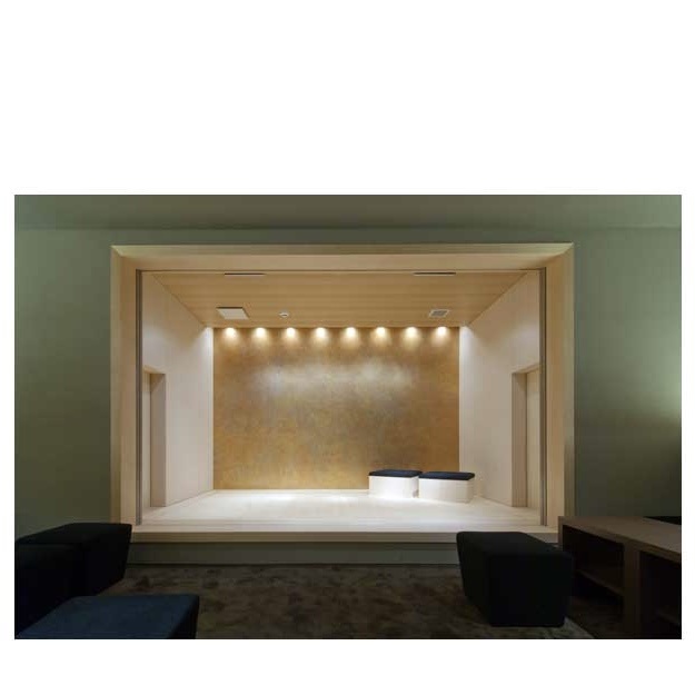 音が良く響くように、壁や天井も吹き抜けで工夫されています。扉が、スッと自動的に静かに開くと、檜の舞台が。檜の香りが漂ってきます。