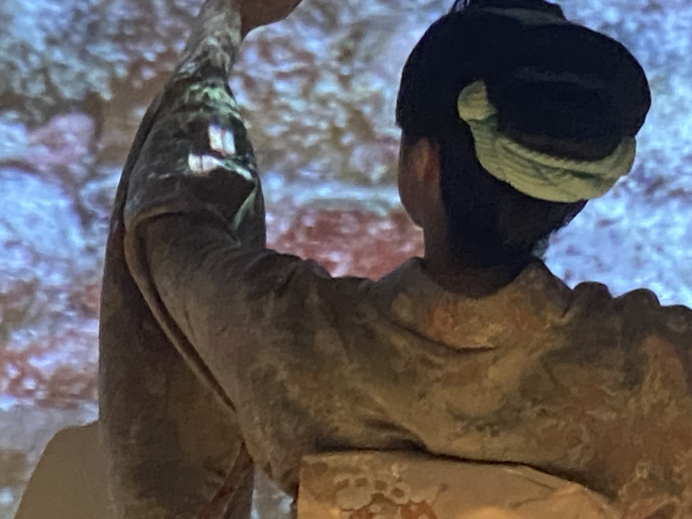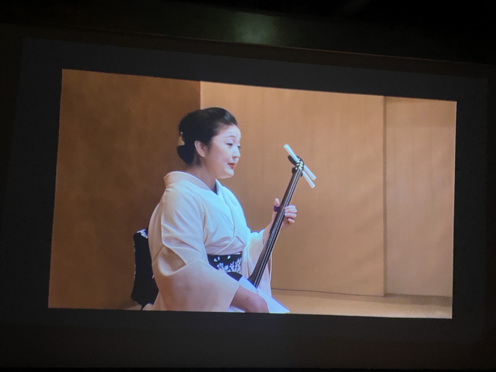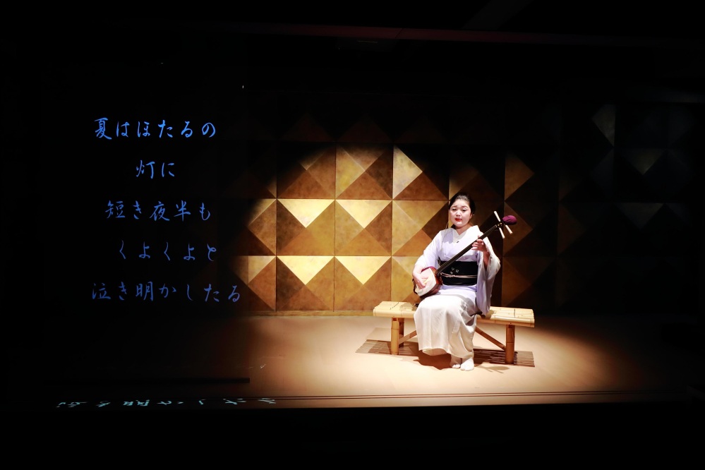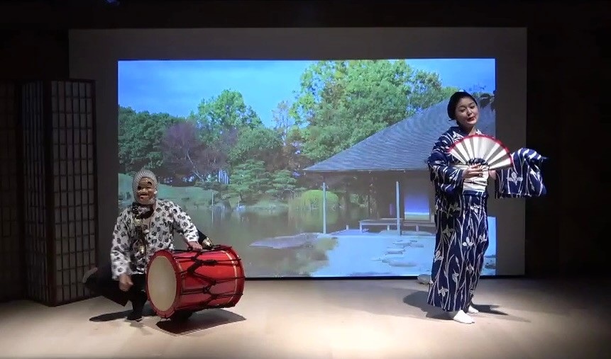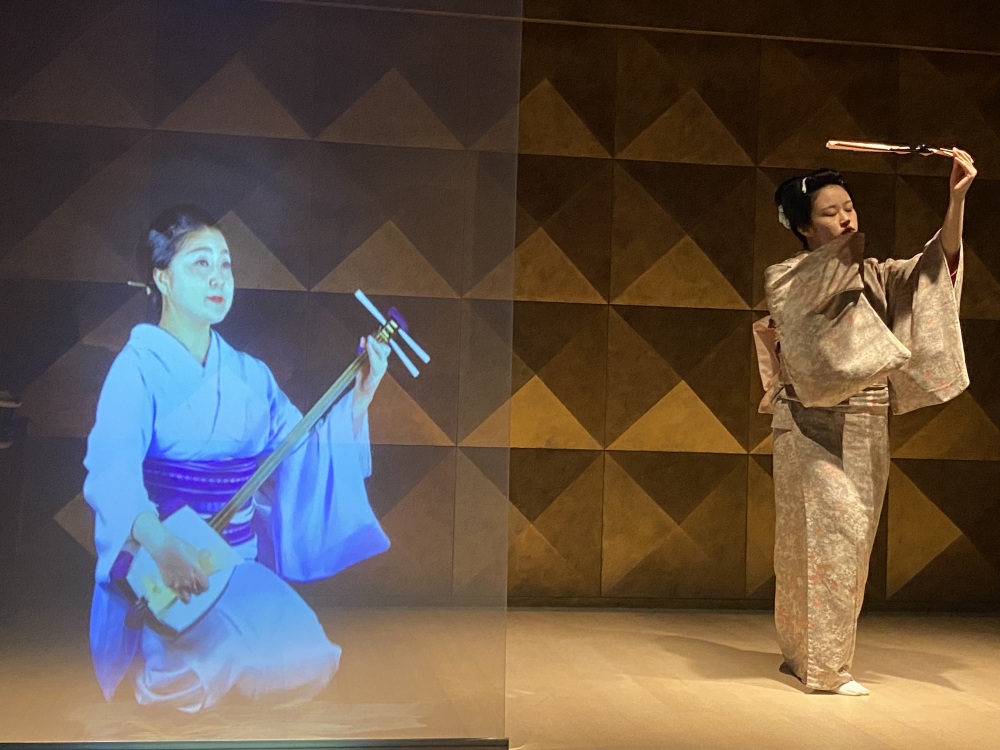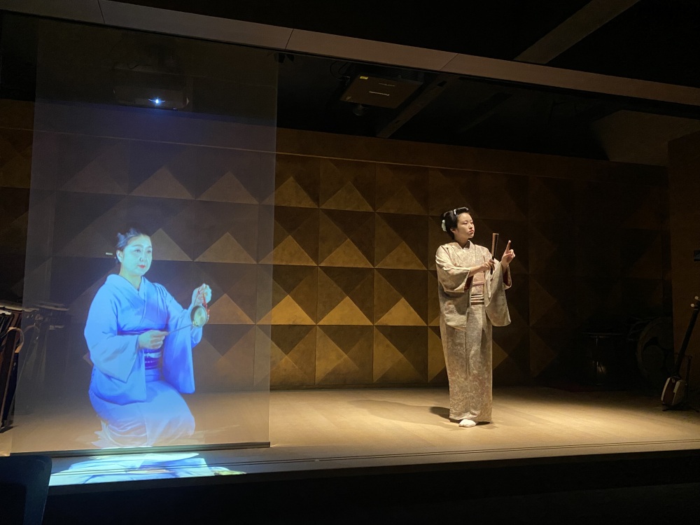 プロジェクションマッピングで、鼓や他の楽器を演奏するももこさんとの共演も!通常の舞台とは異なり、福井産の透過スクリーンを使った最新の演出は「浜町 日々」ならではです。
