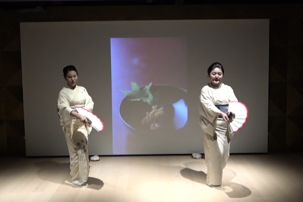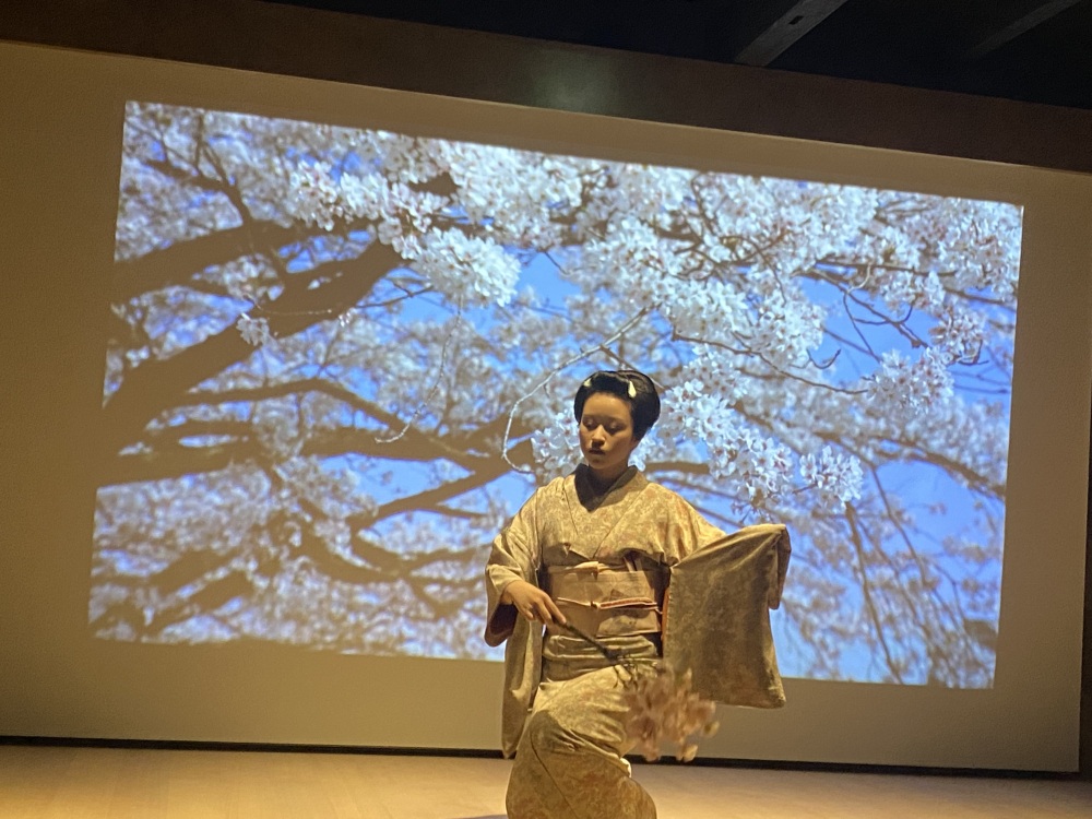 スクリーンに映し出される福井の四季折々の美しい風景を背景に、芸妓のかな恵さんが優雅に舞います。間近で鑑賞することで、舞の繊細な所作や表情だけでなく、舞台の音楽や空間の演出も体感でき、贅沢で五感に響く心に残る体験です。