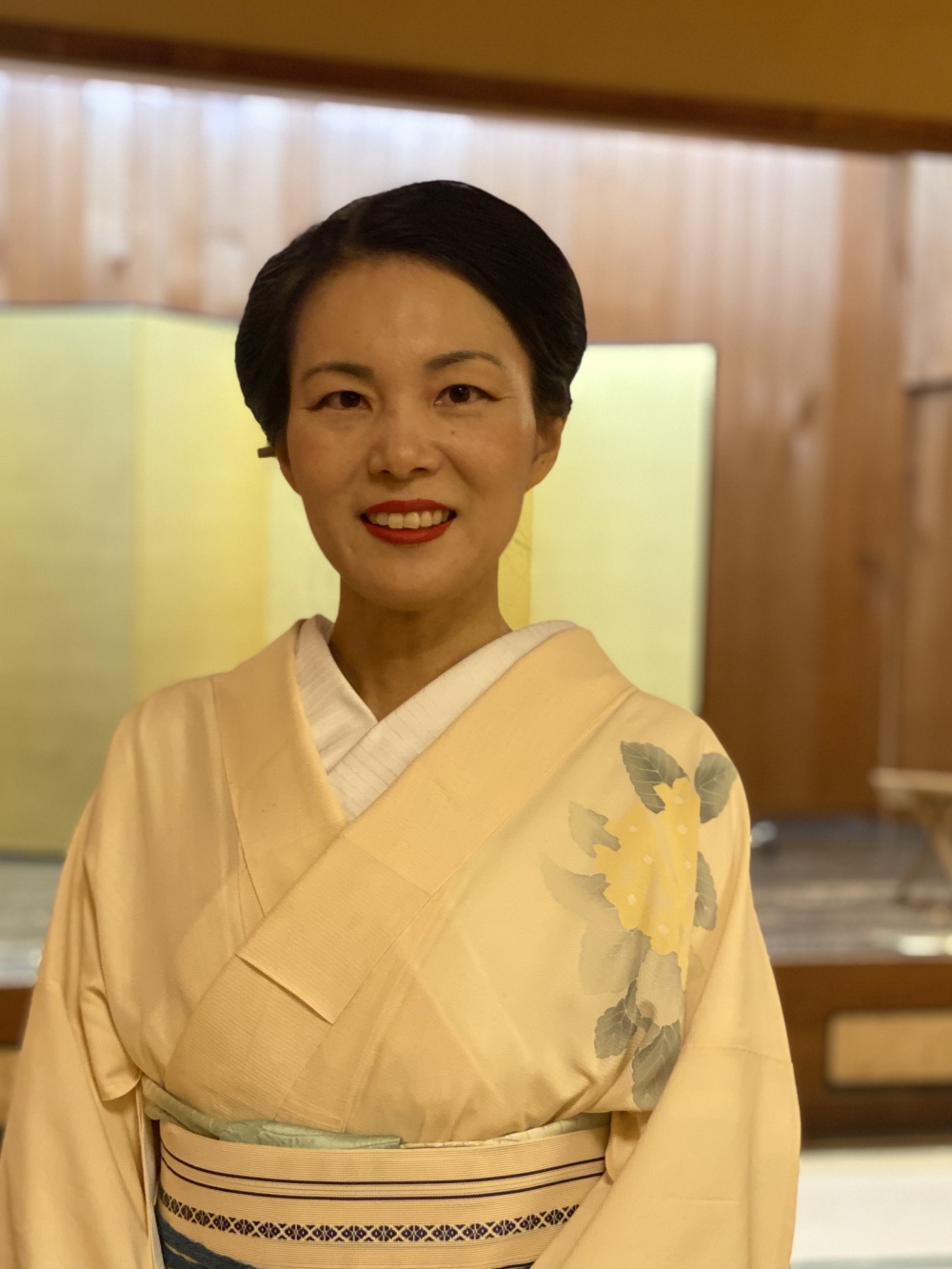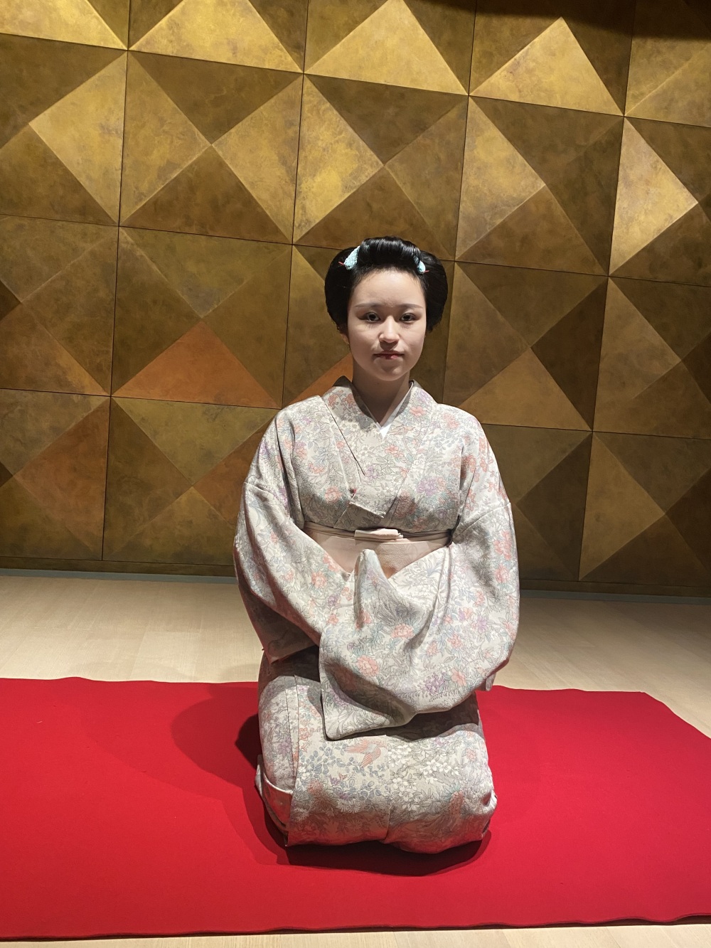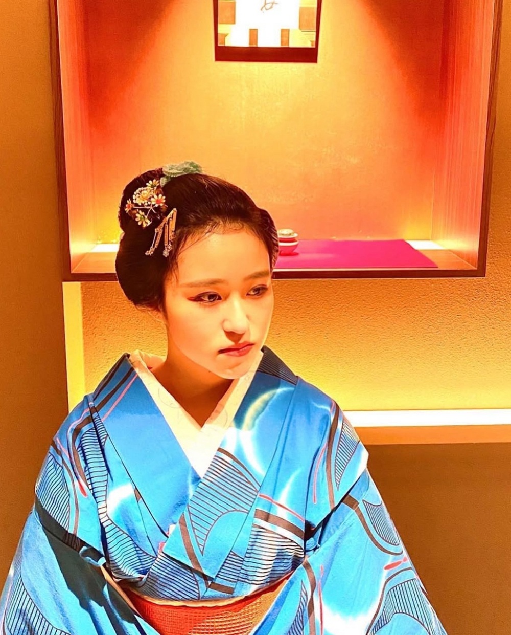現在、「浜町 日々」には3人の芸妓さんがいらっしゃいます。着物姿も凛と美しいかなこさんは、極真空手を習っており、その型(型の動き)が日本舞踊の所作にも役立っているそうです。ちなみに、かなこさんの好きな食べ物は「桃」です。