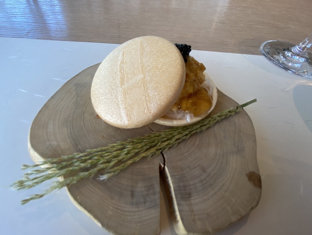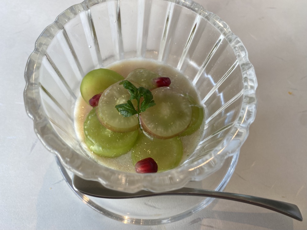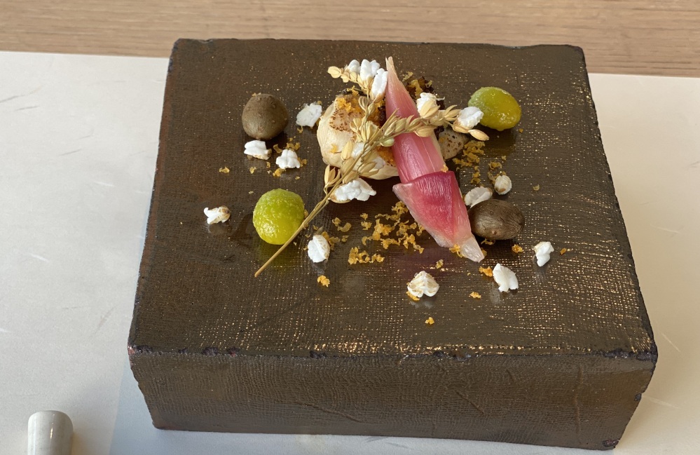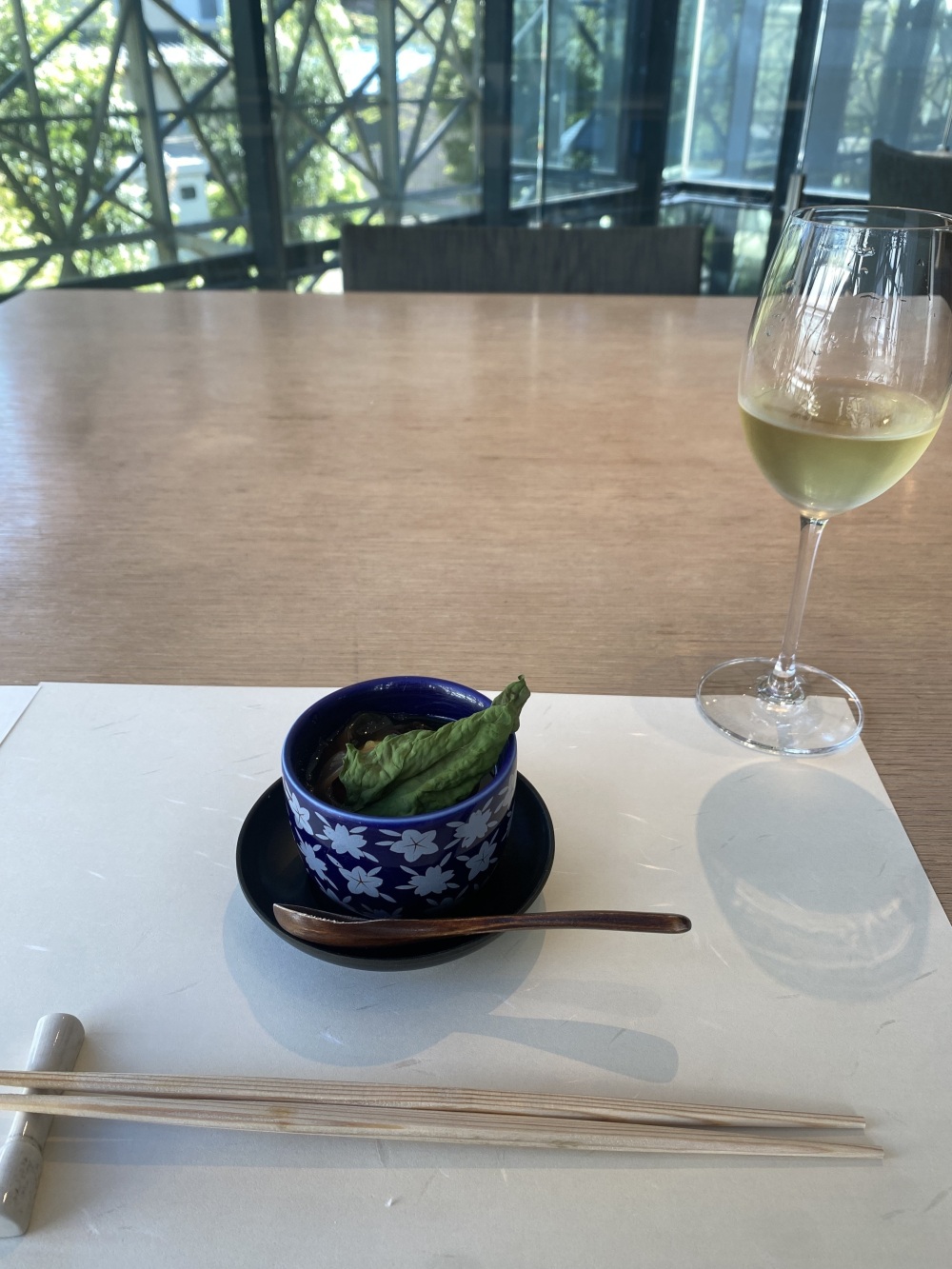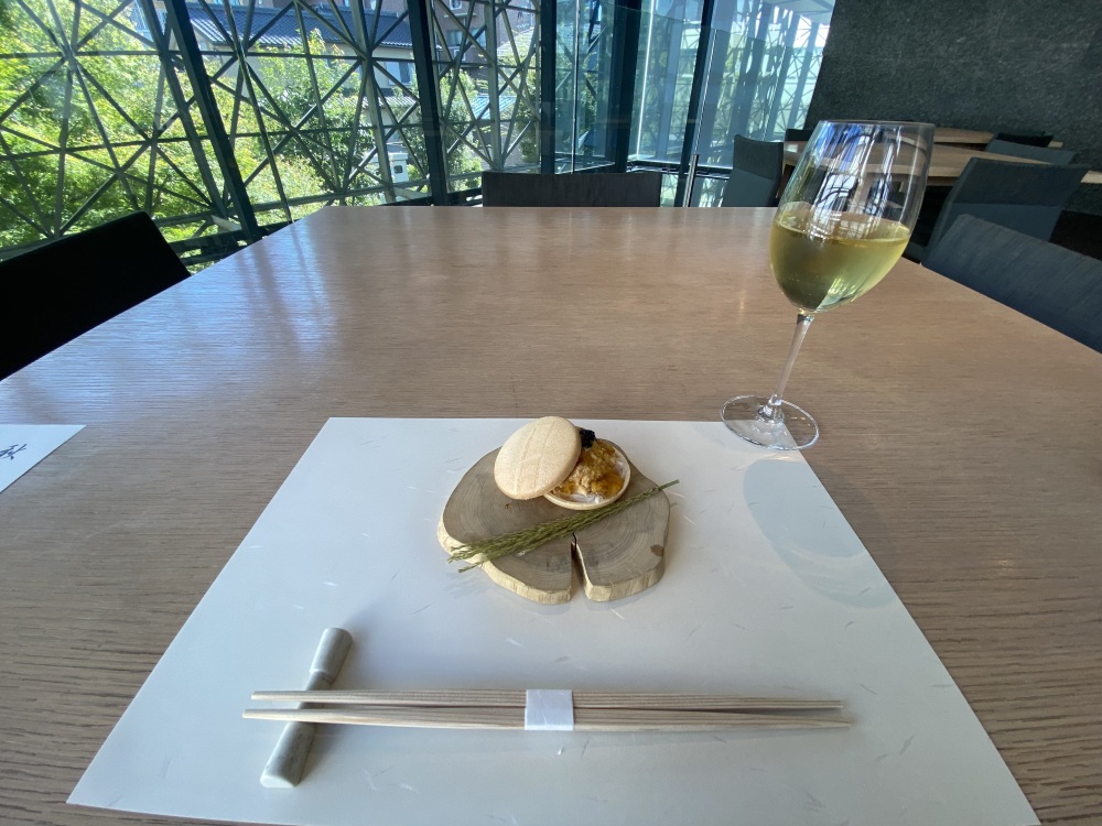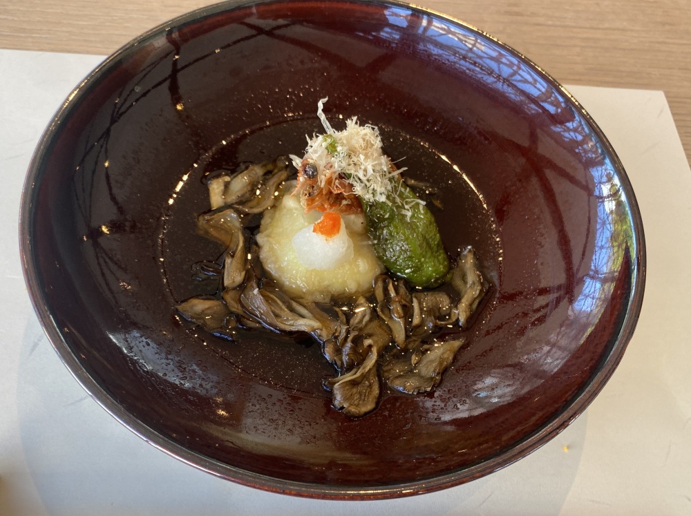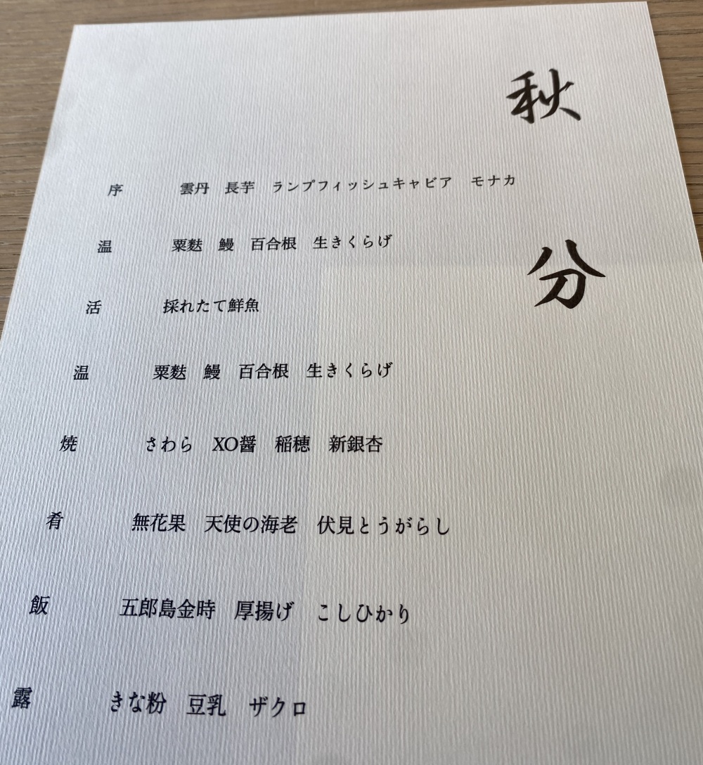 お料理は毎日変わるそうで、今日は「秋分」という献立をいただきました。夏と秋のはざまの9月、澄んだ夜空や美しいお月様、福井の田園を通る爽やかな風を感じられるような、季節感あふれる一皿です。「温」の料理には、温かい百合根の中に鰻が入っており、百合根はもちもちふわふわで弾力があり、とても美味しかったです。