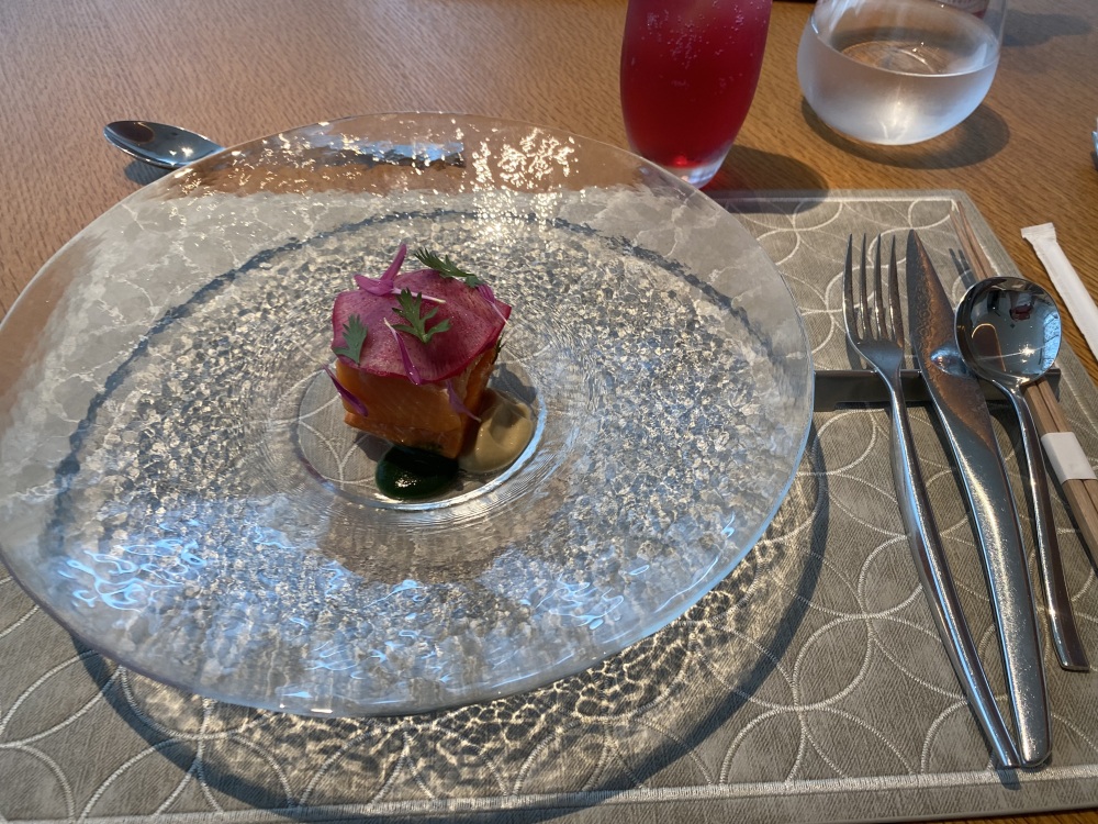 一皿目:ふくい名水サーモンの瞬間スモーク・鯖江産吉川ナスと汐雲丹のエクラゼ・春菊のクーリー