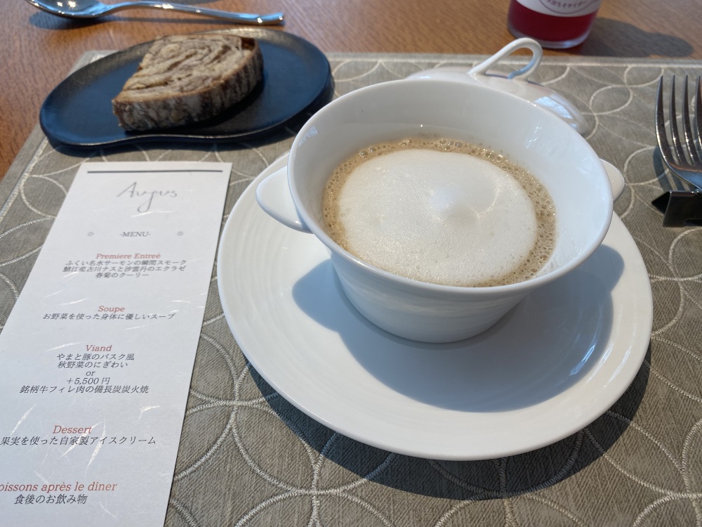 身体に優しい、ふわふわのスープが体にしみわたります。福井県今庄のいぶり柿入りの自家製パンは、初めて出会う美味しさでした。