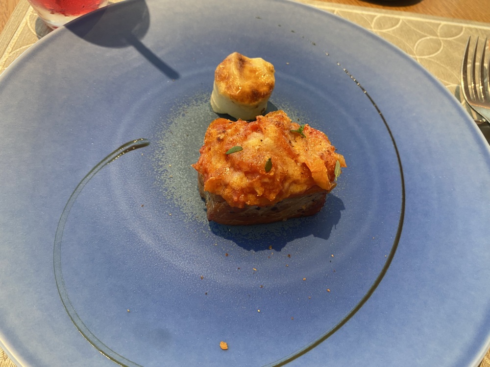 上庄の里芋のグラタンに、秋の気配を感じました。タイムが繊細に添えられており、10月の紅葉が始まる里山の風景が目に浮かぶようでした。