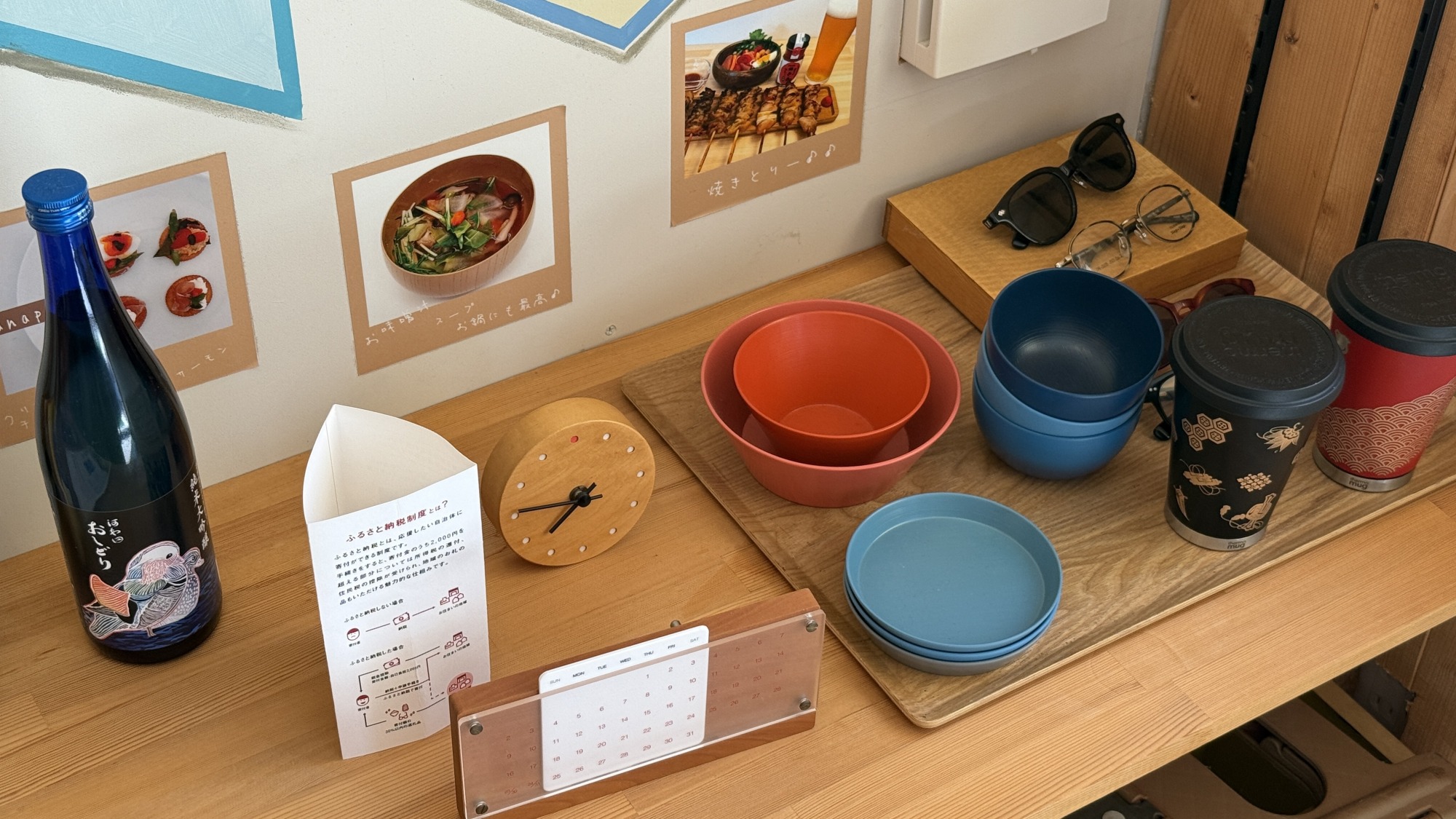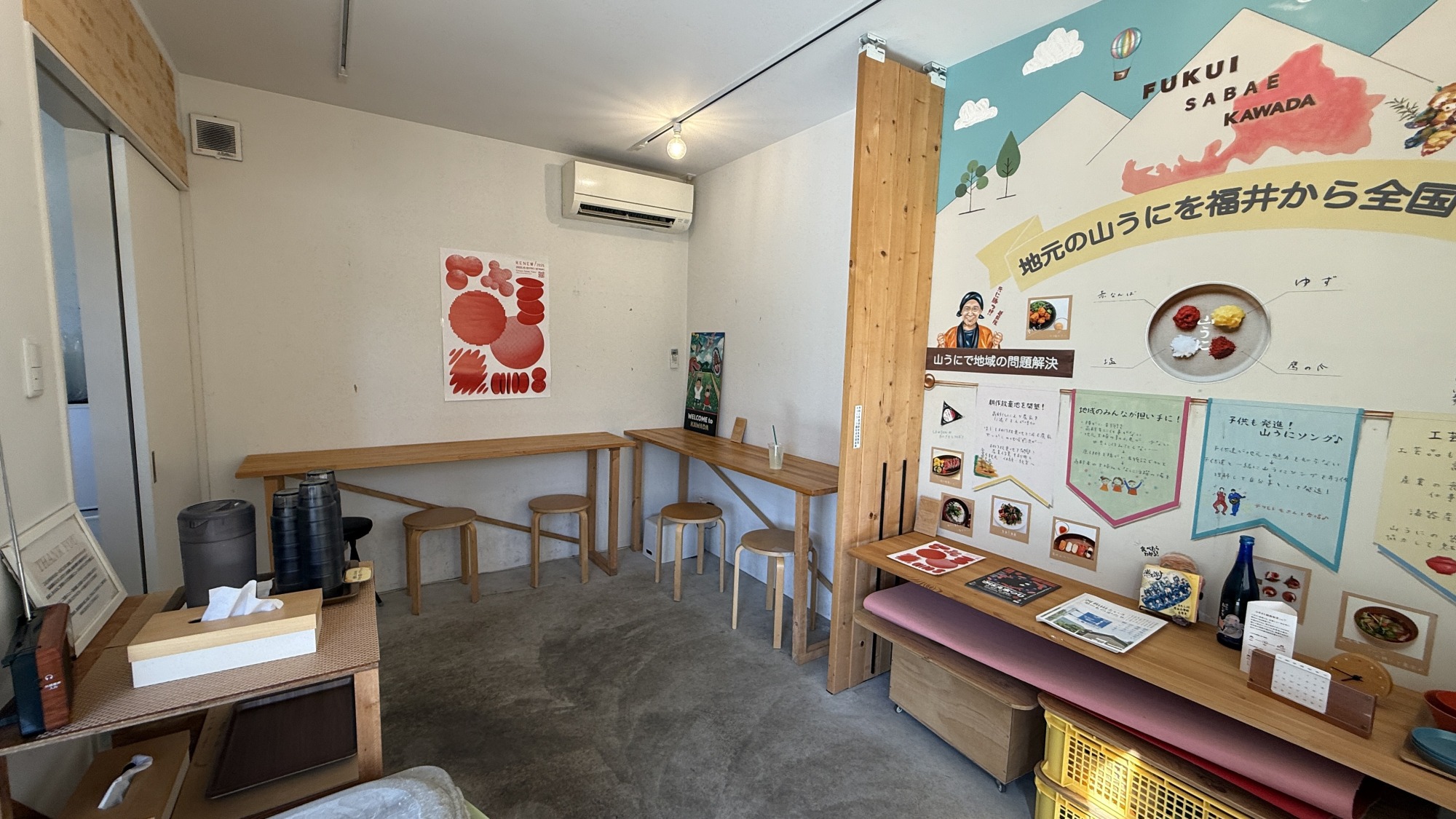 河和田地区のあれこれを紹介する手づくりのボードや、鯖江の地場産品が並び、「ここでゆっくりしていってね」という温かい真心と地域愛があふれている。