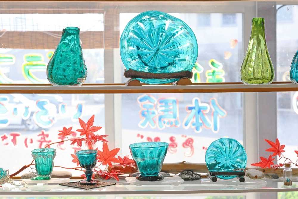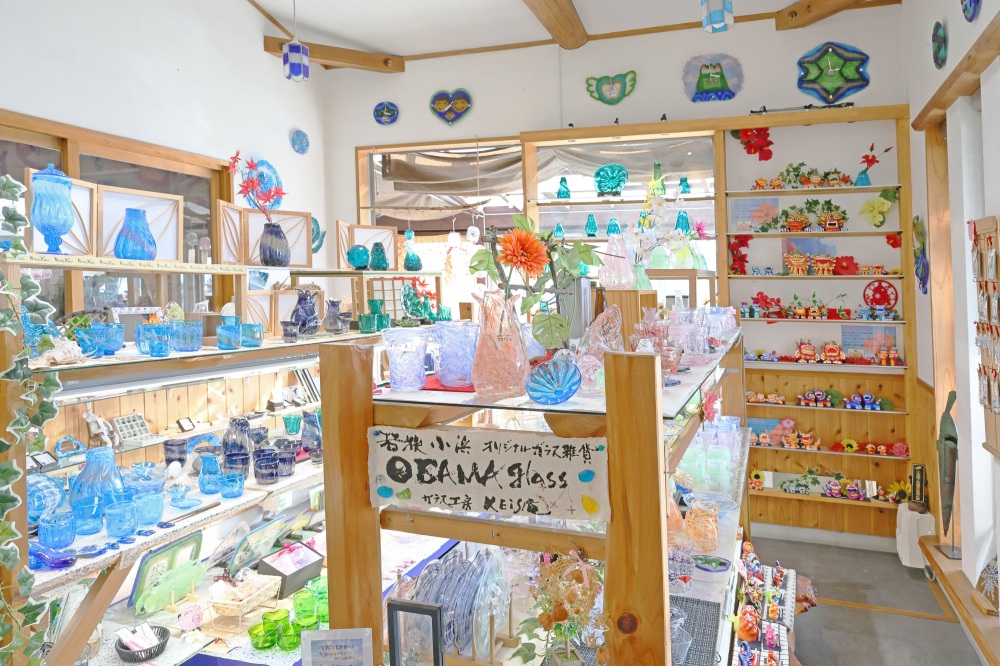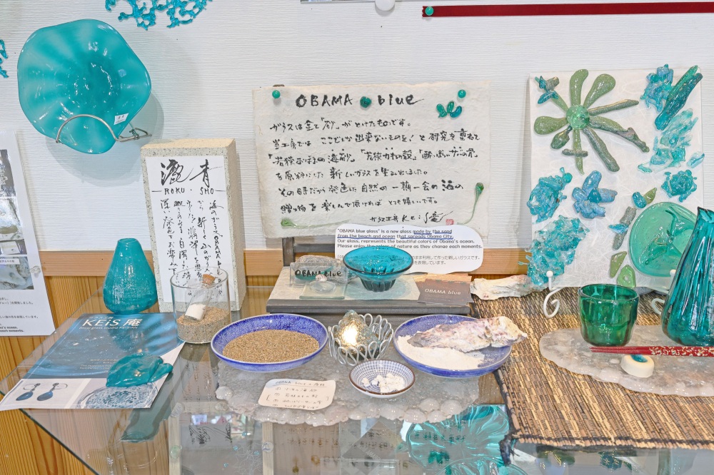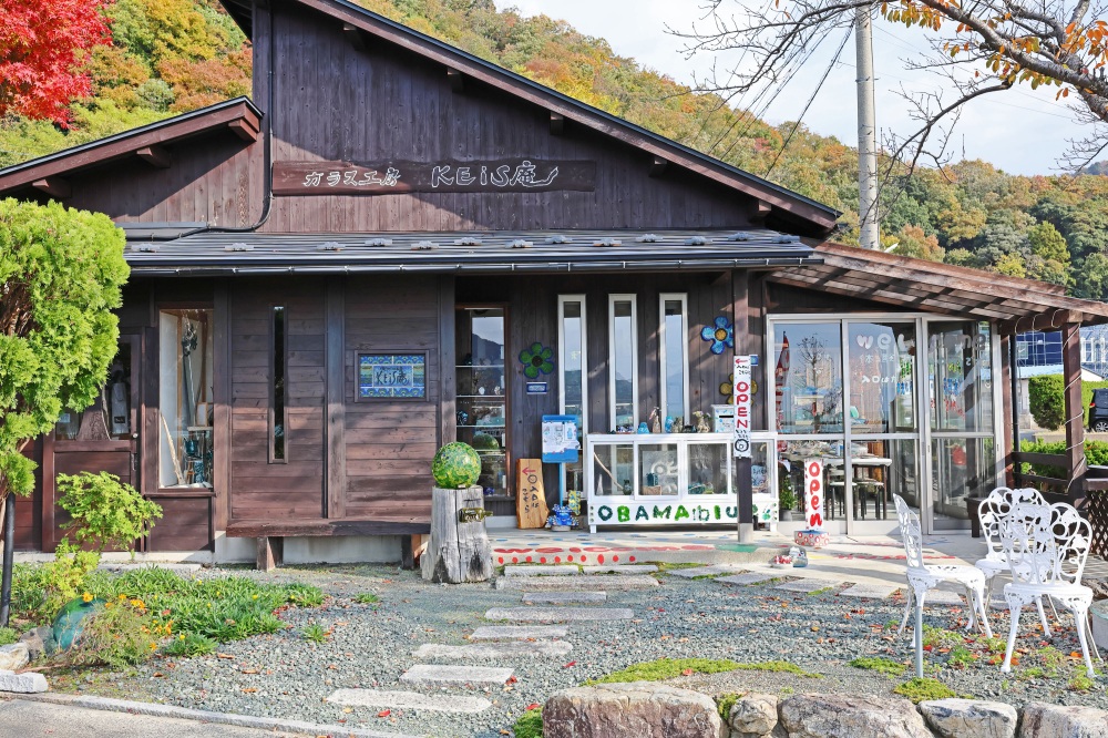 海岸近くに佇む KEiS庵は、小浜愛が詰まったガラスを作る小さな工房兼ギャラリーです。店内には青や緑、やさしい色合いのグラスや食器、花器などが並びます。ひとつひとつ店主が想いを込めて作るガラスは、光を受けるたびに表情を変え、その美しさはまるで小浜の海そのものを閉じ込めたような作品たちです。その中でもこの工房が作るオリジナルガラス「OBAMA blue」と「OBAMA blue~漉青(ろくしょう)~ 」は、小浜湾で採取した海砂や地域の牡蠣の殻や魚の骨、駆除されるシカの骨などを原料に使用した、地元の“海”や“暮らし”の素材から生まれたガラスです。その色味はどれも一点もので、深みのある色は日々の生活に彩を与えてくれます。観光やドライブの途中にふらっと立ち寄れる心温まる場所で、カラフルなガラスを使ったフォトフレームやドアプレート制作、グラスや皿への絵付け体験なども楽しめます。詳しくは公式HPをご覧ください。