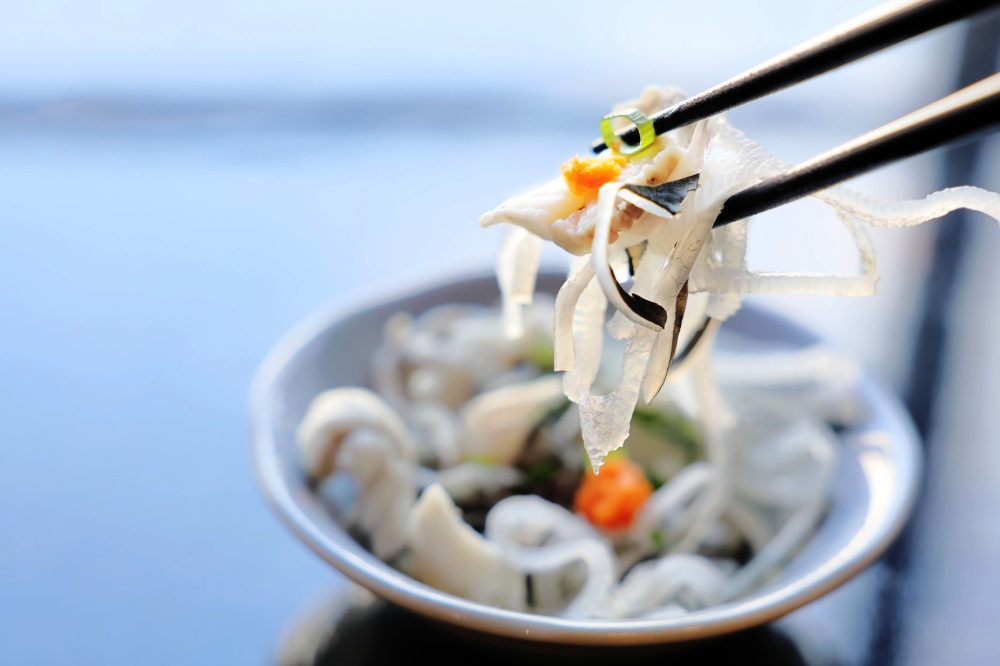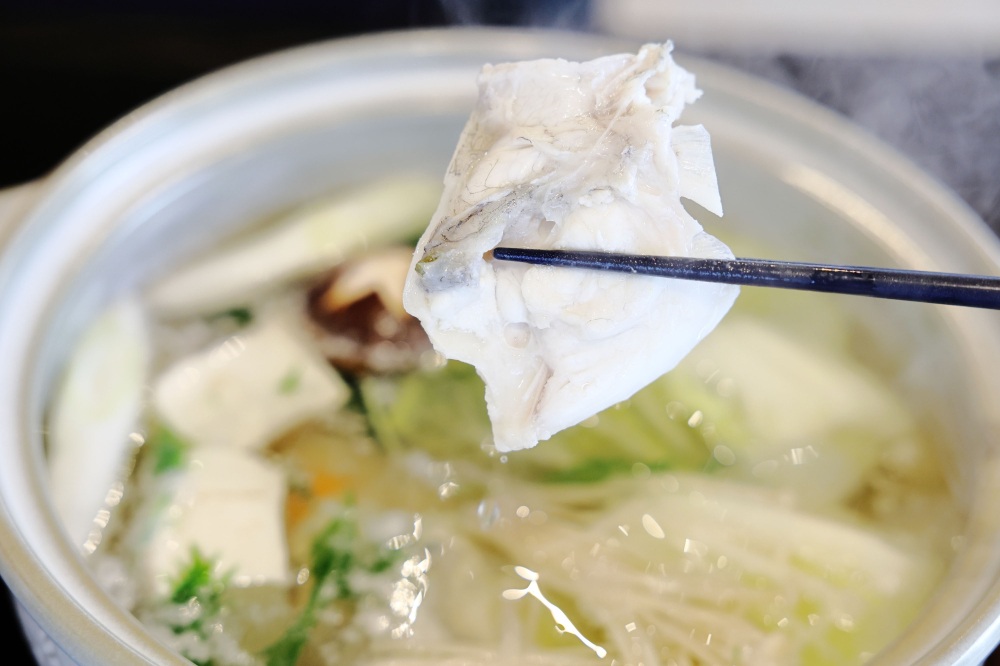若狭ふぐの最大の魅力は淡白でありながら深みのある味わいで、火が通った白身はふっくらと弾力があり、ポン酢との相性も良くほどよい酸味がふぐの味を引き立て、上品な甘さと澄んだ旨みが口いっぱいにひろがります。