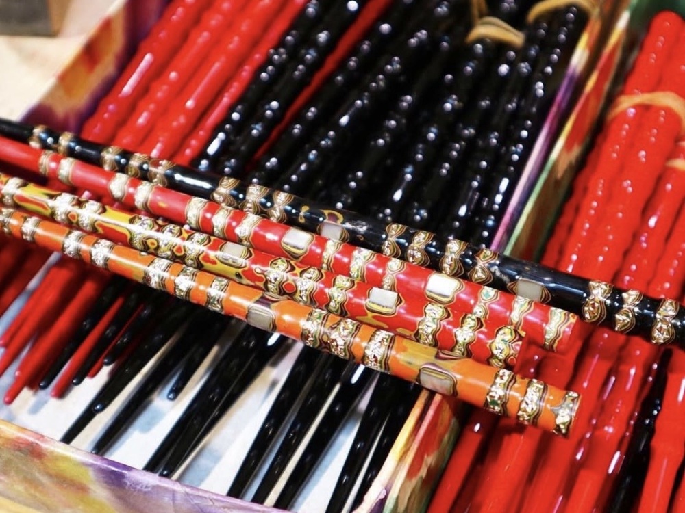 小浜市にある「若狭工房」で、若狭塗の「箸の研ぎ出し(1,300円)」が体験できます。アワビ貝や卵の殻が埋め込まれている若狭塗のお箸を約40分ほど転がしながら全面をこすっていきます。