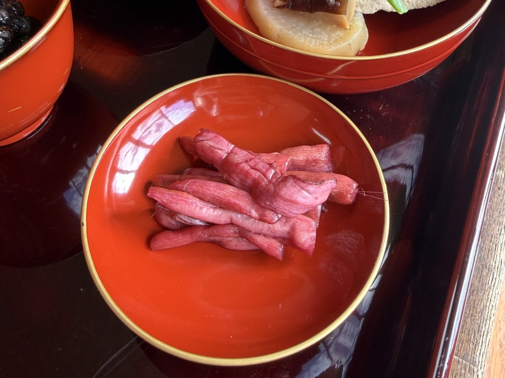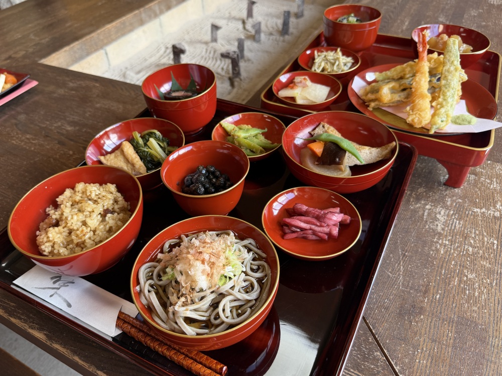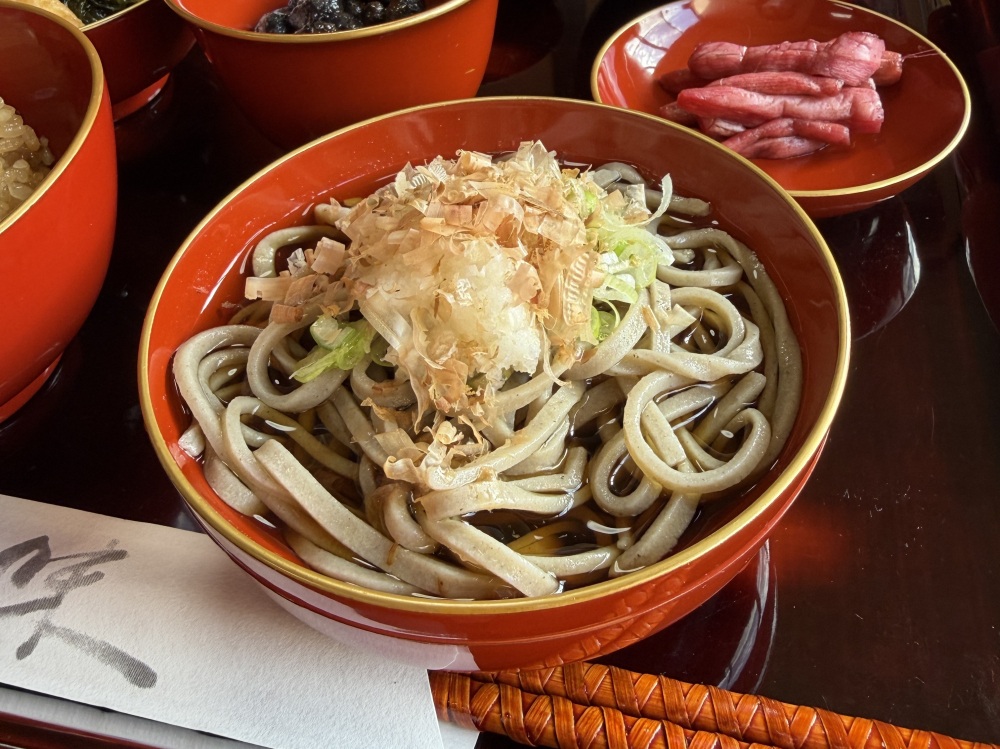 一の膳には、昆布巻き・七夕豆のピーナッツ和え・煮物各種・菜葉の煮物・むかご胡麻和え・すこ・茶飯・おろしそばが、美しい赤い漆器に盛り付けられています。