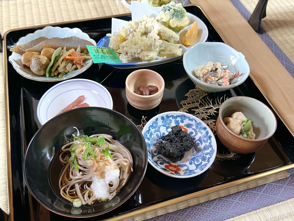 地のものを使用した手づくりの伝承料理は、一つ一つ手が込んでいて美味しくて健康的!掘りごたつに座って、あたたかみに包まれながら味わうことができます。また、予約なしでも通常メニューの今庄おろしそばや天ぷら、手づくり料理は食事をすることができますよ。
