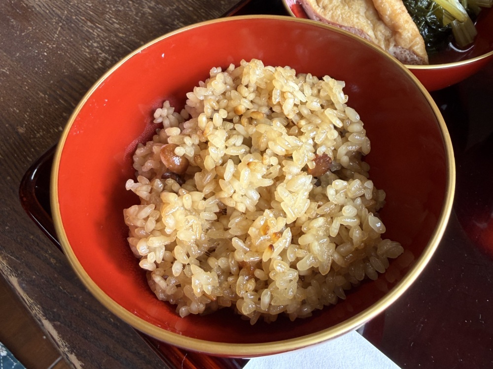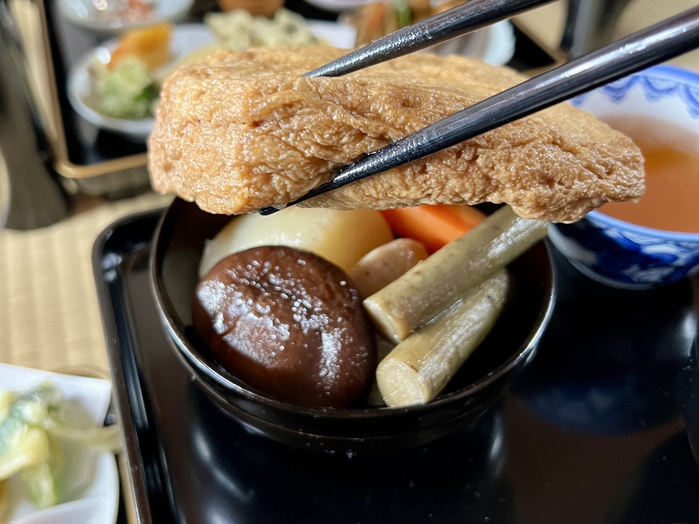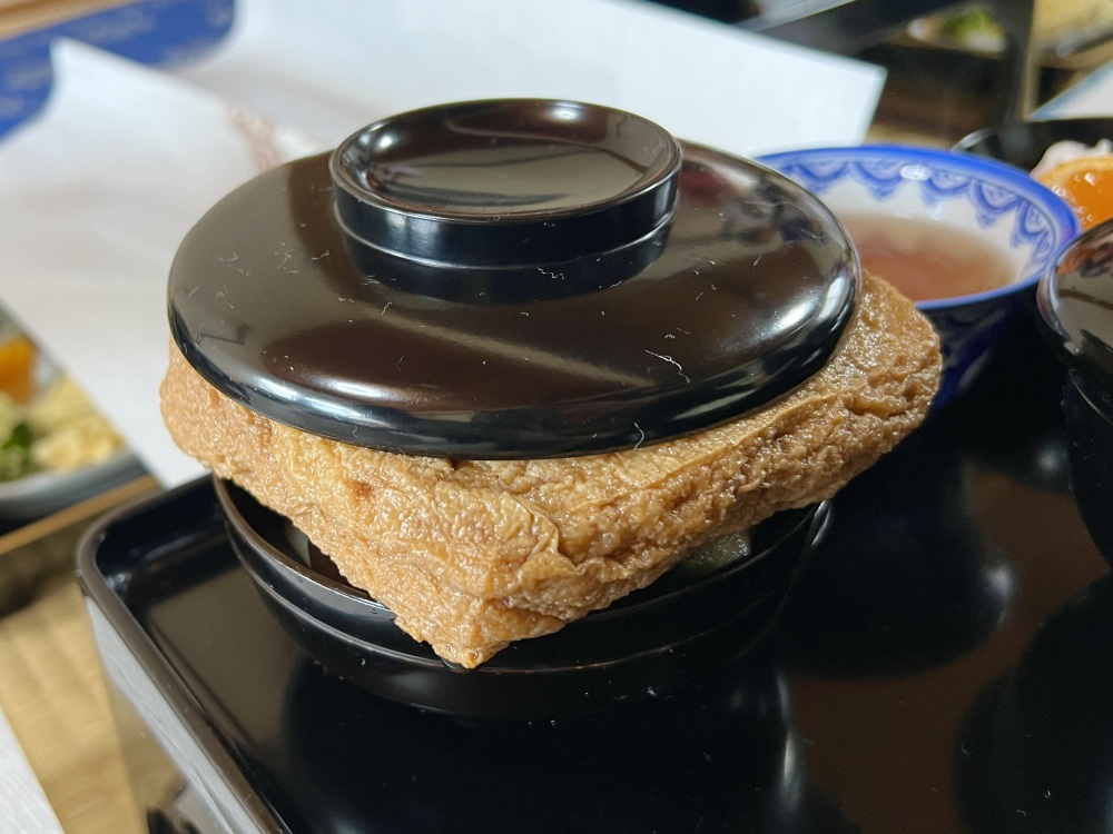 こちらのお店の油揚げは、お椀からはみ出すほどの大きさ!だし汁がしっかりしみこんで、ふっくらとしています。油揚げの下には、椎茸や牛蒡などの煮物がごろごろと入っています。