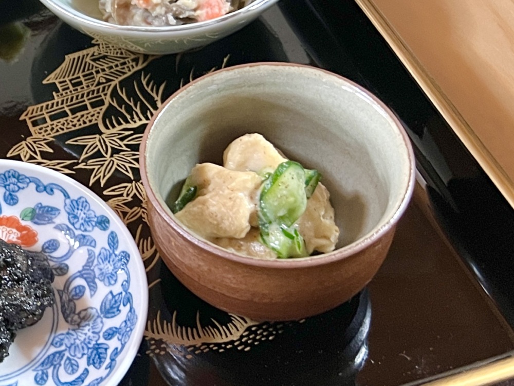 「麩の辛し和え」は麩や味噌が使われるため、こちらも報恩講料理のなかでは貴重なたんぱく源です。ぬるま湯で戻した角麩をよく絞り、塩もみした小口切りのきゅうりと合わせ、調味料に和辛子の一種である福井県の「からし種」でつくった「地からし」を使う、独特な香ばしさが特徴の料理です。上品な辛みが絶妙でファンも多く、嶺北地域ではスーパーのお惣菜コーナーでもよく売られていて馴染み深い郷土料理の一つです。