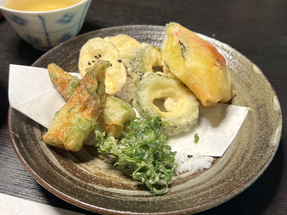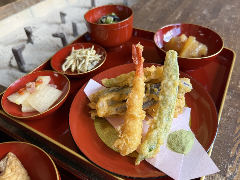 二の膳には、里芋ときんぴらと蒟蒻の煮物・野菜の天ぷら・すこ・金時豆・白和え・越前おろしそば・むかご(長芋や自然薯などの芋の葉の付け根にできる球芽)胡麻和え・麩の辛し和えが盛り付けられています。