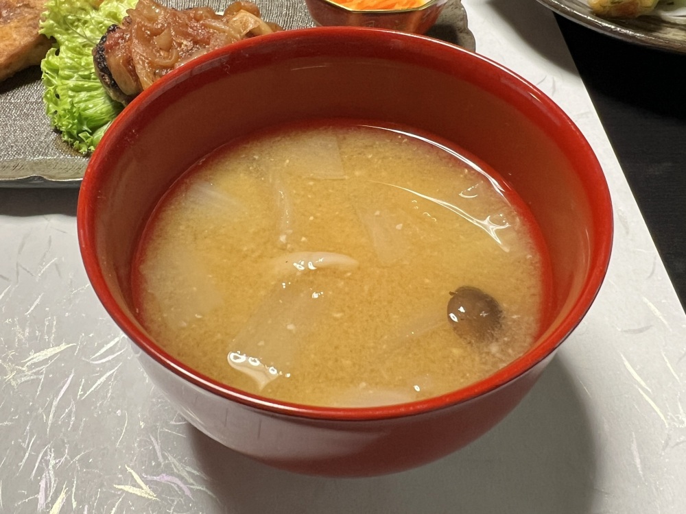 「打ち豆」は越前に古くから伝わる伝統的な大豆加工食材で、「呉汁(ごじる)」は一晩水に浸した大豆をすりつぶし、味噌汁に溶かしてつくる福井の郷土料理の一つです。味噌汁の中には大豆のコクがたっぷり!たんぱく質が豊富で、身体をやさしく温めてくれる汁ものとして親しまれてきました。また、地域によっては「豆汁」と呼ばれることもあり、奥越地域では「ひき汁」の名で親しまれています。