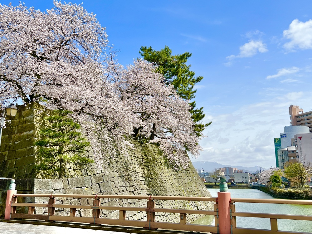 福井駅西口から徒歩約5分のところにある「福井城址」は、春になると桜と歴史が調和する、福井市中心部屈指のお花見スポットになります。福井城の跡地で、福井市内で採掘された笏谷石(しゃくだにいし)の石垣とお堀に囲まれた風景は、満開の桜をより一層美しく引き立てます。