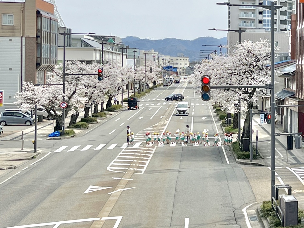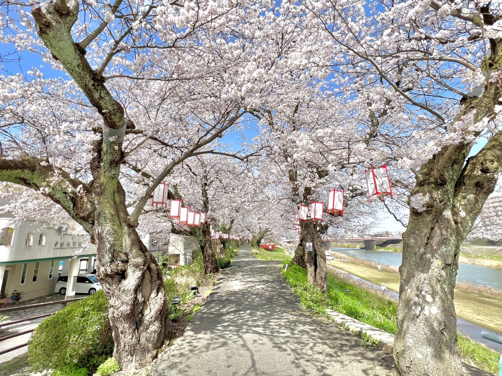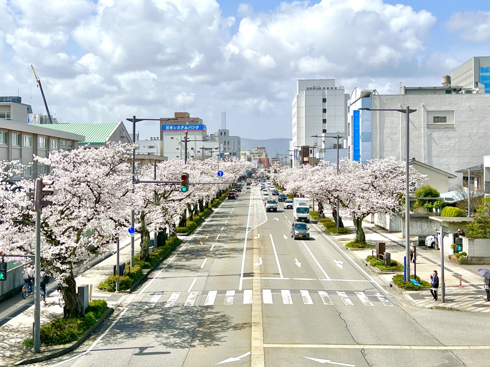 福井市中心部を東西に横断する幹線道路で、普段は人や車が行き交うにぎやかな通りですが、桜が咲き誇る季節になると、まちの空気は一変。やわらかな桜色に包まれ、歩くだけで心がほどけるような、ゆったりとした時間が流れるさんぽ道へと姿を変えます。