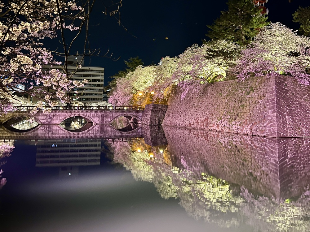 日本遺産に認定されている(「福井・勝山 石がたり〜中世・近世のまちづくり、そして現代〜」の構成文化財の一つ)福井城址の石垣とお堀は、昼は桜と青空に映え、夜はライトアップによって幻想的な表情に。昼と夜でまったく違った景色をのぞめるお堀端は、福井駅から最も近いお花見・さんぽスポットとして、地元の人にも観光客にも親しまれています。