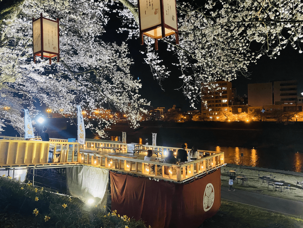 夜には、ぼんぼりの灯りによるライトアップで幻想的な雰囲気に。河川敷に設けられる「桜床(さくらゆか)」では、春風を感じながら飲食をたのしむこともでき、昼と夜で異なる雰囲気を見せてくれます。