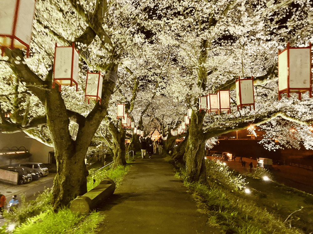 桜まつりの時期には、足羽山一帯がライトアップされています。画像は、愛宕坂(あたござか)の様子です。笏谷石の階段が行灯で照らされた先に福井のまち並みが見えて、ここだけで体感できる、光と影が溶け合う特別な雰囲気に包まれます。