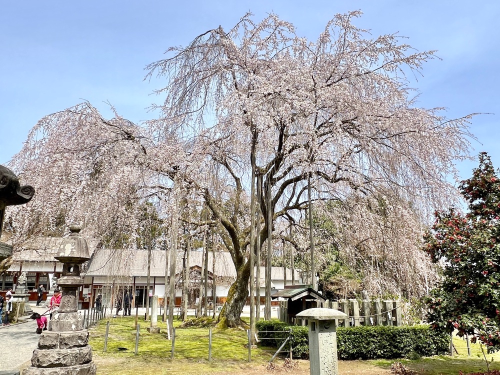 足羽川の桜並木を満喫した後は、歩いて約10分のところにある足羽山(あすわやま)へも足を運んでみてください。足羽山の中腹にある足羽神社(あすわじんじゃ)境内のほぼ中央に立つのが、古くから「足羽さんのシダレザクラ」として親しまれてきた一本桜。福井市第二号天然記念物に指定されており、樹齢はおよそ380年。枝が四方に均等に垂れ下がり、満開を迎える4月上旬には、薄桃色の美しいドーム状の花姿を描きます。