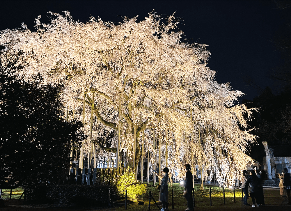 夜にはライトアップが行われ、昼間のやさしく華やかな姿とは一変。闇の中に浮かび上がるドーム型のシダレザクラは、どこか妖艶で幻想的な美しさをまとい、忘れられない春の記憶を刻んでくれます。