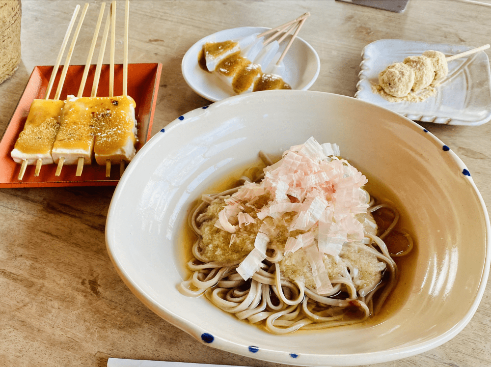 足羽山には茶屋もいっぱいあります。画像は左から、足羽山の定番名物の豆腐田楽とこんにゃくおでん、お団子、福井グルメおろしそば。豆腐田楽とこんにゃくおでんは、福井特産の地がらしや木の芽が使われた甘辛い味噌が特徴となっていて、地元民にとって春を感じる味わいです。