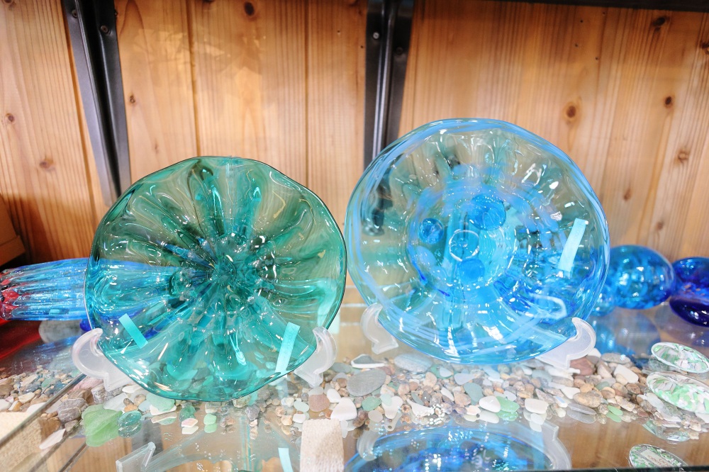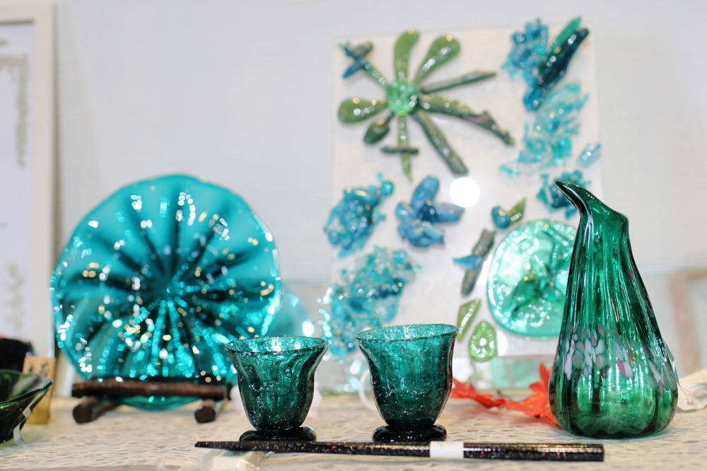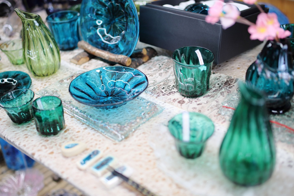 店内に足を踏み入れると、青や緑を基調としたやさしい色合いのグラスや食器、花器が静かに並び、まるで海のきらめきに包まれるような空間が広がります。ひとつひとつ、店主が想いを込めて生み出すガラスは、光を受けるたびに表情を変え、その輝きはまるで小浜の海をそのまま閉じ込めたかのよう。どの作品も一点もので、奥行きのある色彩が日常にそっと彩りと癒しを添えてくれます。