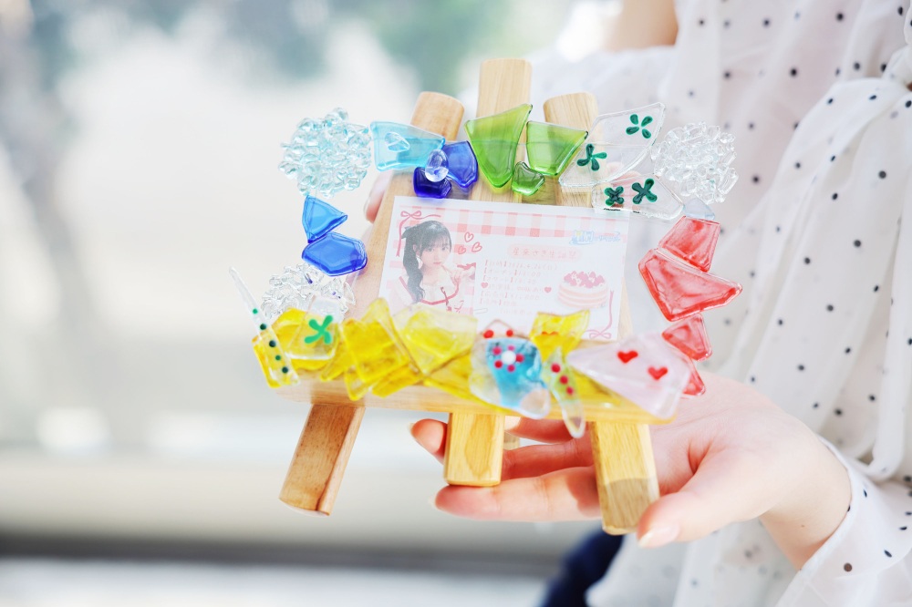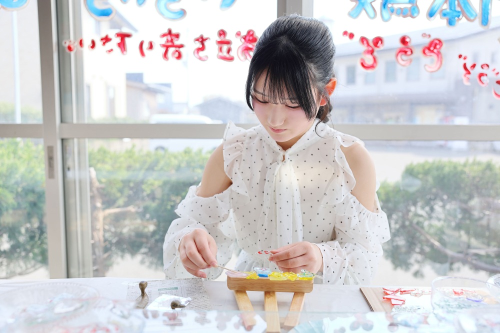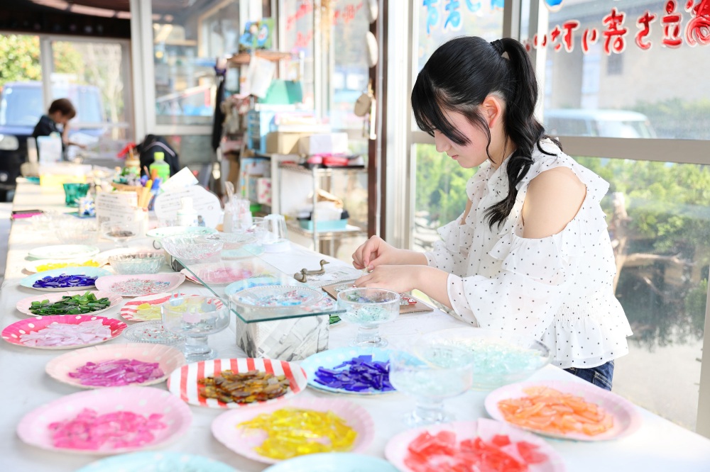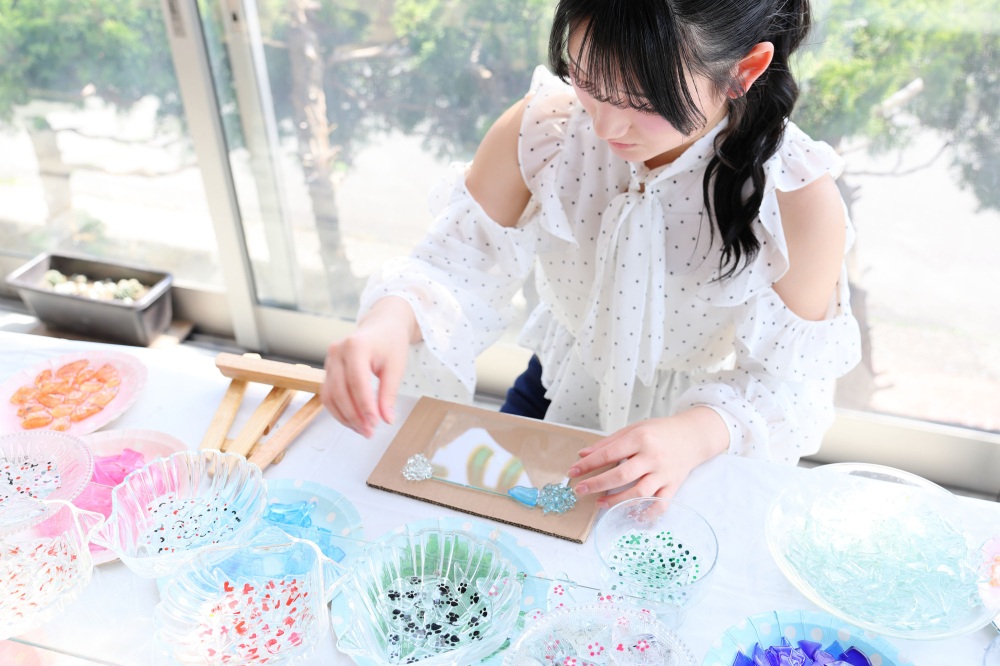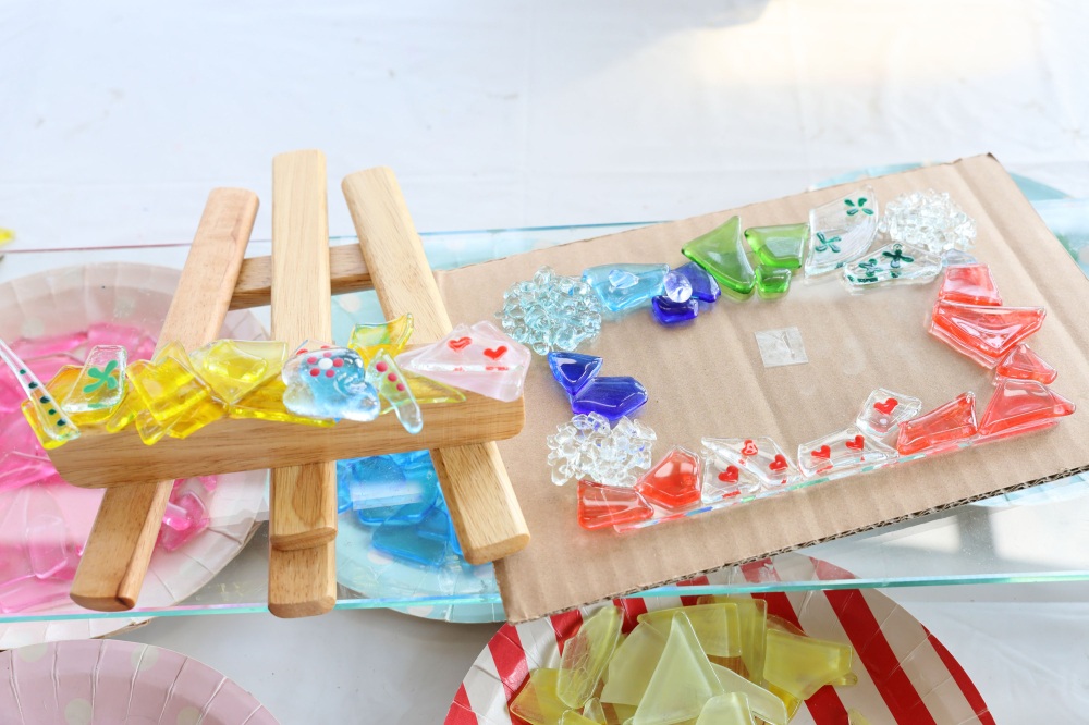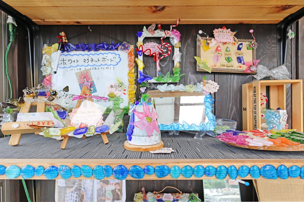 体験内容は、色とりどりのガラス素材を使ったフォトフレーム、LEDランプなどの小物づくりや、ガラスに好きな絵や文字を書く絵付けなどがあります。