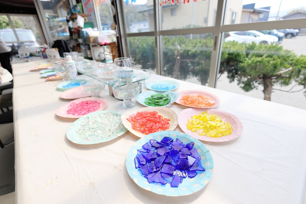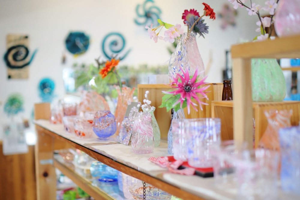 観光やドライブの途中にふらりと立ち寄れるこの場所では、作品を眺めるだけでなく、自ら手を動かす楽しさも味わえます。カラフルなガラスを使ったフォトフレームやドアプレート制作、グラスやお皿への絵付け体験など、旅の思い出を“かたち”にできる体験も魅力のひとつです。