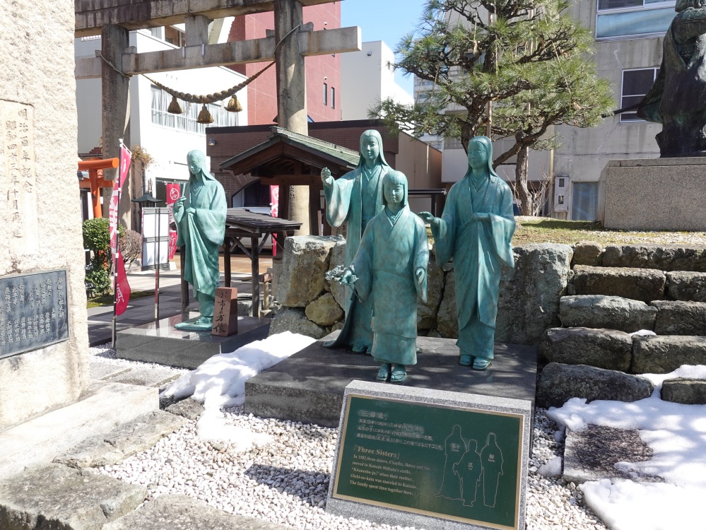 境内には柴田勝家と妻のお市(織田信長妹)、浅井三姉妹(お市娘)の銅像があります。