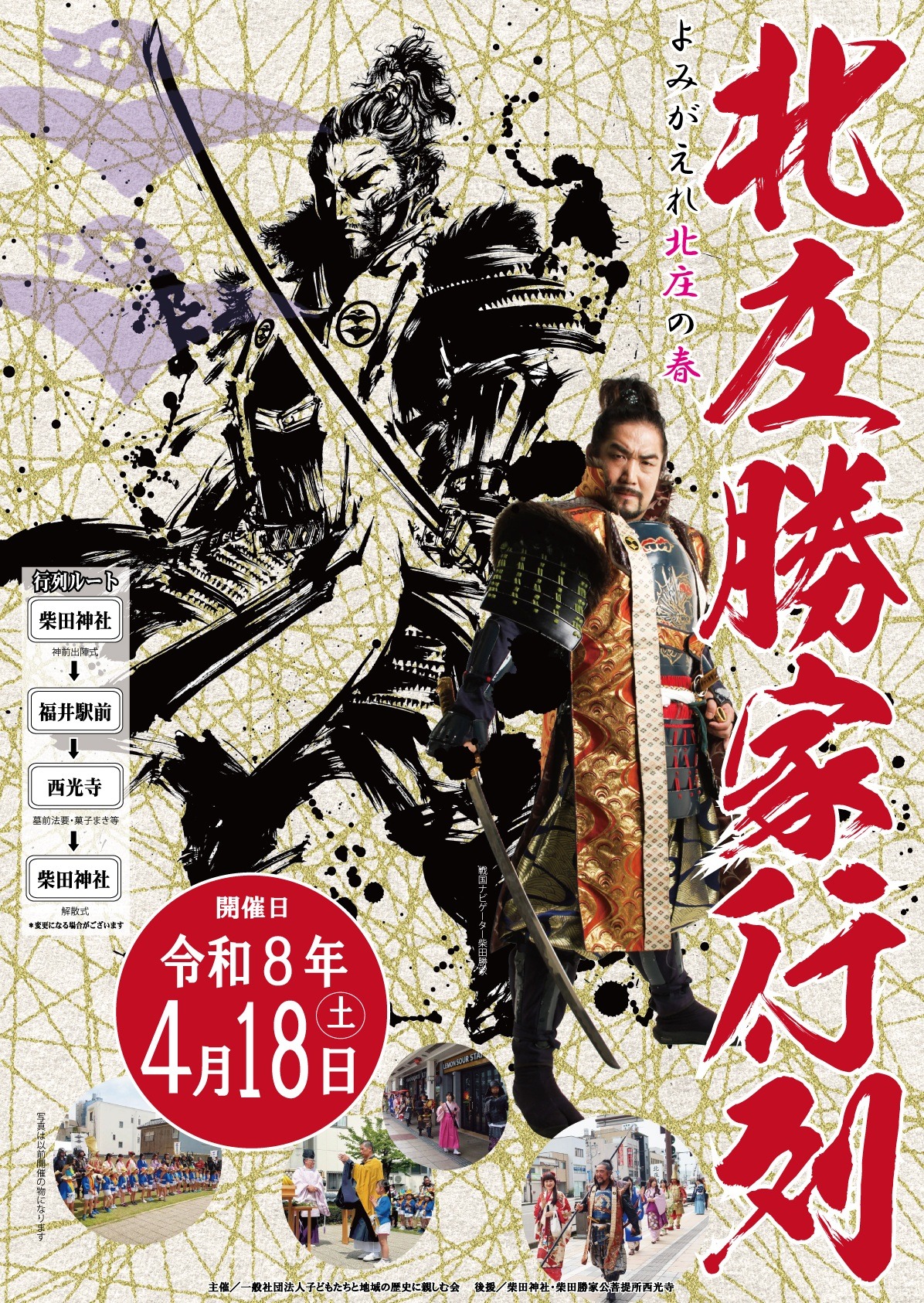 4月18日に開催される北庄勝家行列は甲冑隊やお姫様(共に一般募集中!)・西光寺保育園の園児達とともに柴田神社から西光寺を往復するイベントです。