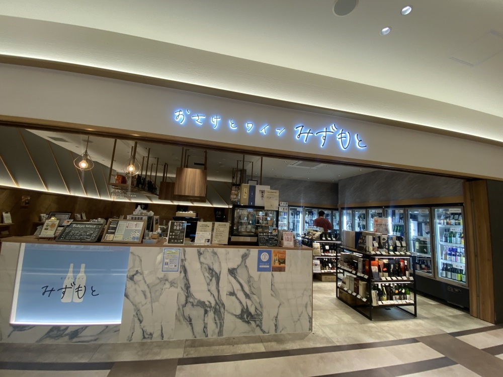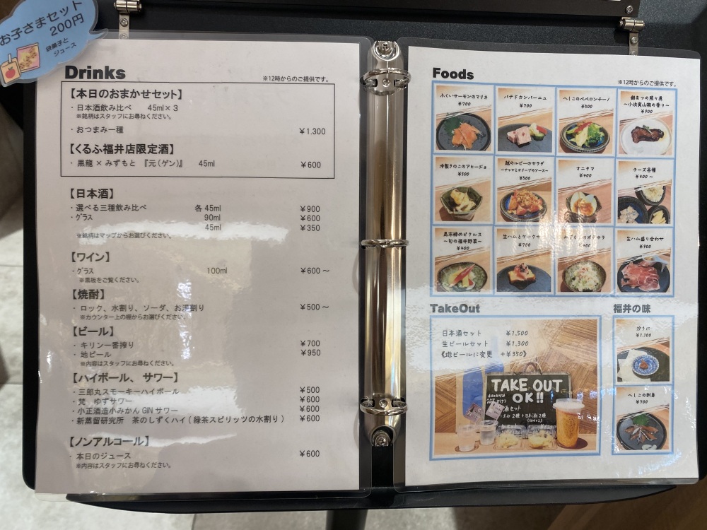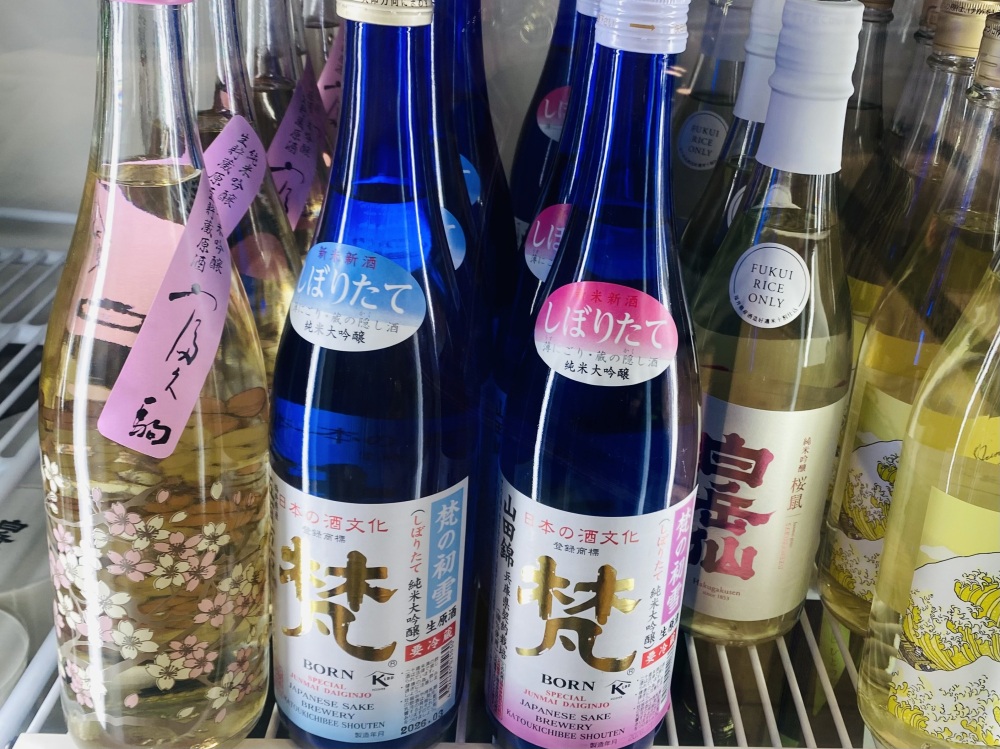 くるふ福井駅「お酒とワイン みずもと くるふ福井駅店」に併設する角打ちスペースでは、福井サーモンやへしこのペペロンチーノなどの地元の食材とあわせて、県外と福井県内27の蔵元の日本酒を1杯350円より楽しめます。冷蔵ケースのなかにある久保田酒造の『富久駒純米吟醸生貯蔵原酒』(2,300円税込)も、桜のイラストが華やかで美しくおすすめです。
