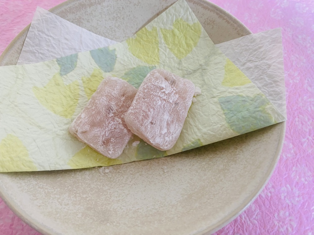 『さくら羽二重餅』には、丹念に刻み上げた塩漬けのさくらの葉が贅沢に練り込まれています。口に含んだ瞬間、ふわっと広がる桜の上品で甘やかな香り、幻のもち米が織りなす極上の食感。春の訪れを五感で楽しむ逸品です。2個ずつの個包装なので、配りやすく衛生的で、車内の移動中でも食べやすいのも嬉しいですね。