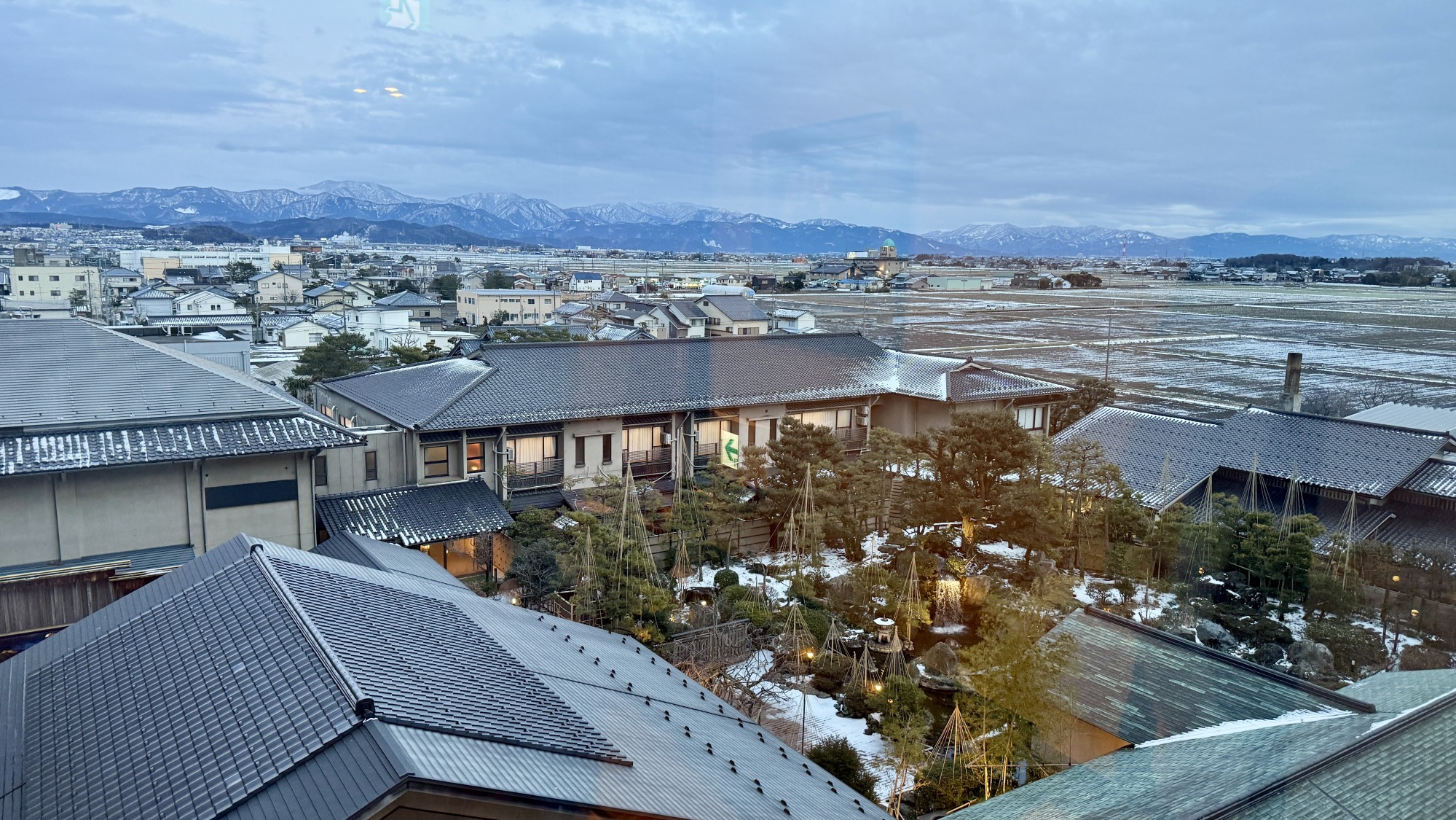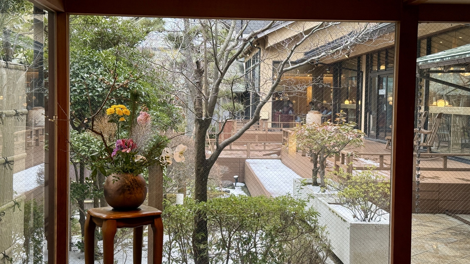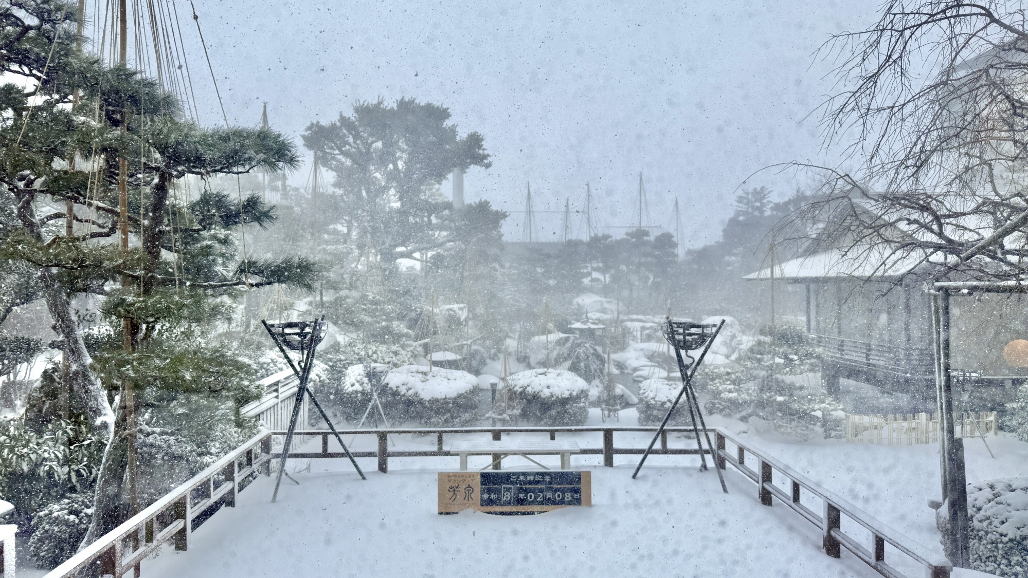 最高のお部屋に一面雪景色…雪が降る中の朝風呂で温まって、真っ白な日本庭園にうっとりし、ますます思い出に残る滞在となった。