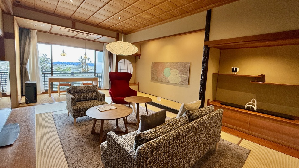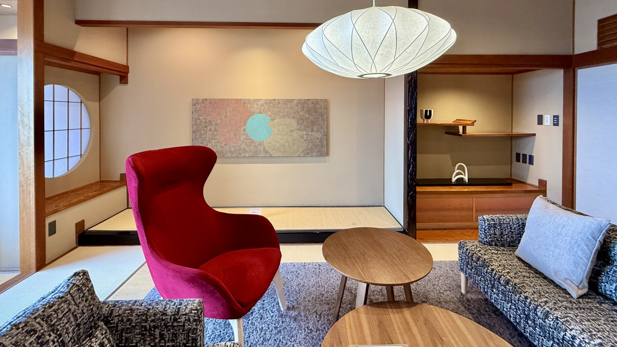 広々としたきれいな和室に、デザインセンスの塊みたいな家具と美術品。