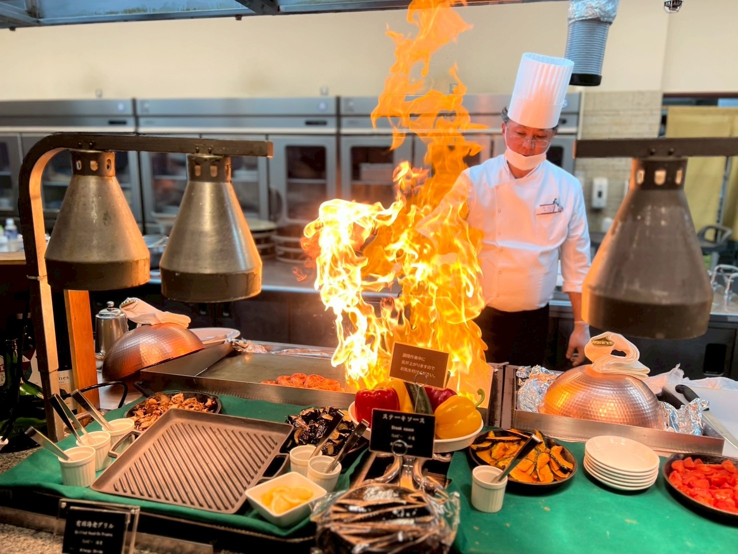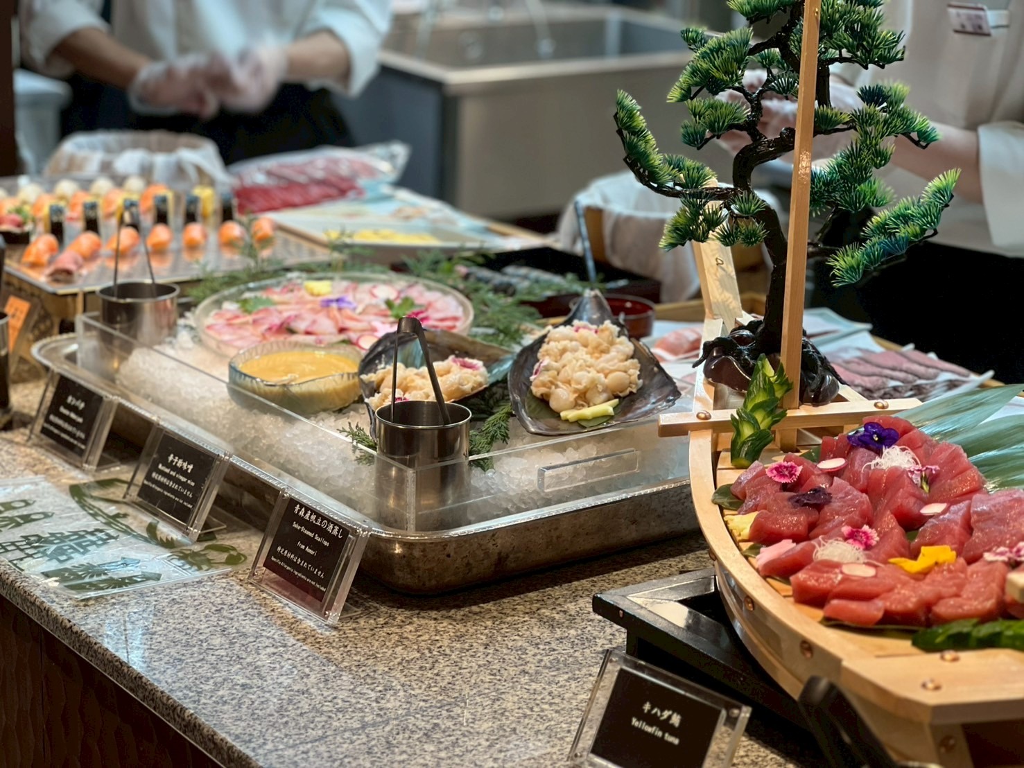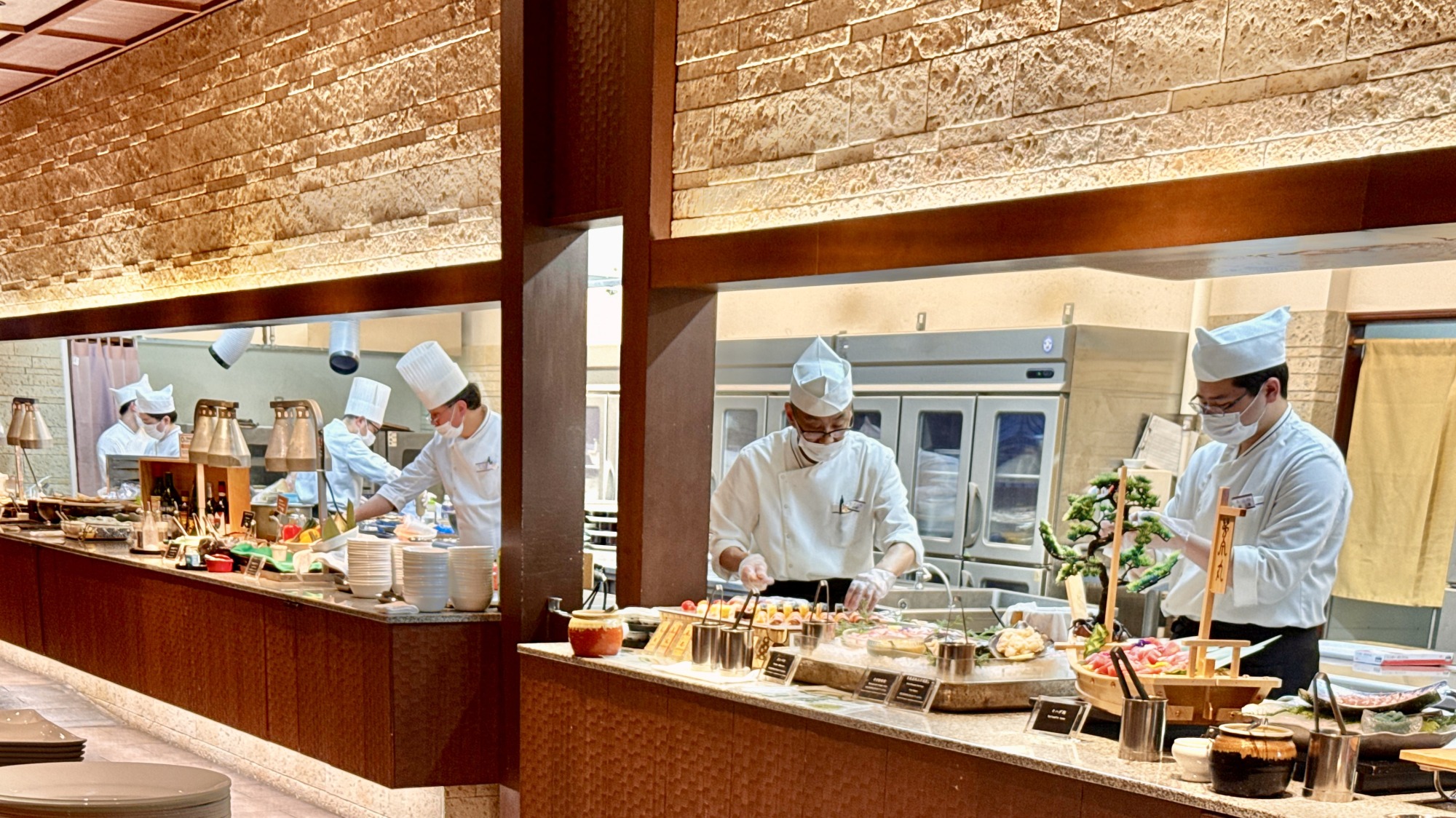 ずらりと並ぶライブキッチン。それぞれ持ち場のシェフが自慢の料理を繰り広げていて、そのどれもが出来立て・焼き立て・握りたて…そんな夢のような体験をすることができる。