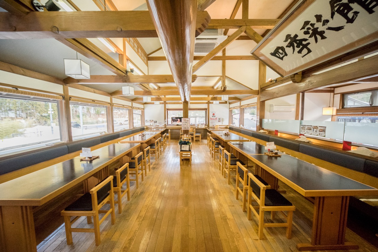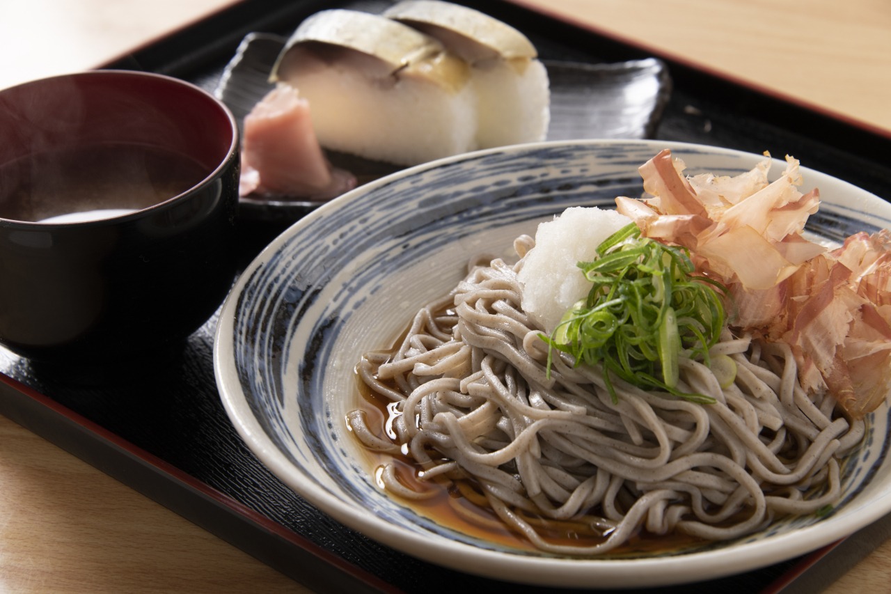鯖街道熊川宿の特産品である「鯖寿司・焼き鯖寿司」「鯖だし和風ラーメン」、熊川くずを使用した「くずうどん(12月~3月までの期間限定)」や福井のソウルフード「ソースカツ丼」、「越前そば」など提供しています。