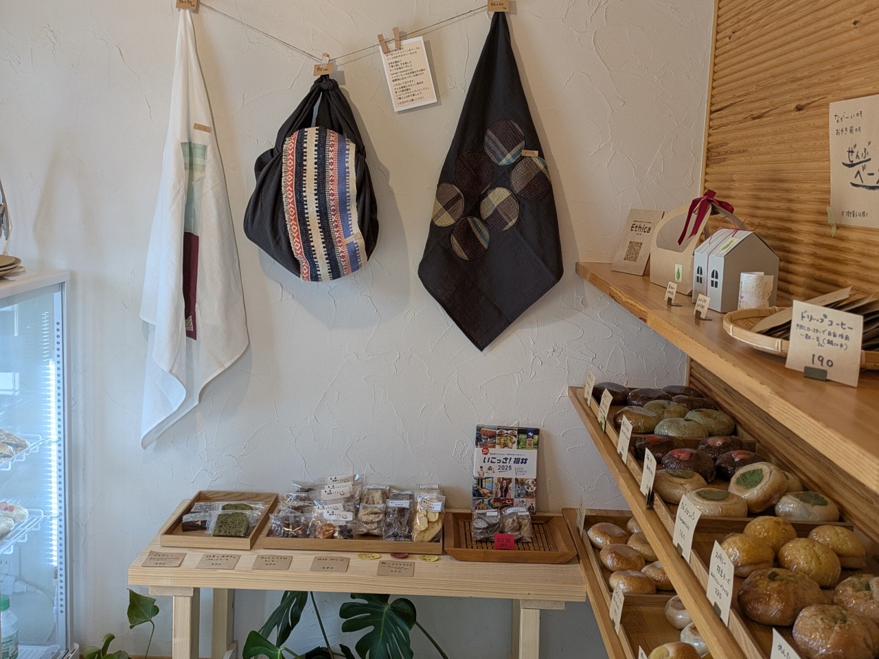 ベーグルは福井産小麦と北海道の春よ恋、きび砂糖、塩、天然酵母だけで生地を 手作りしています。バターを使わないので低カロリーです。具材や焼き菓子も、なるべく自家製野菜や国産を使用し、身体と心に優しいを心がけています。