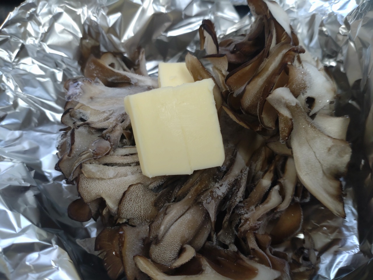 素材の美味しさそのままに、九頭竜まいたけにバターを乗せて、焼き加減はお客様のお好みでお召し上がりください。お好み焼き・鉄板焼き「モリモリ」は越前市の住宅地にひっそりとある、隠れ家的なお店。温かみのある店内はアットホームな空間で、気軽にくつろげます。